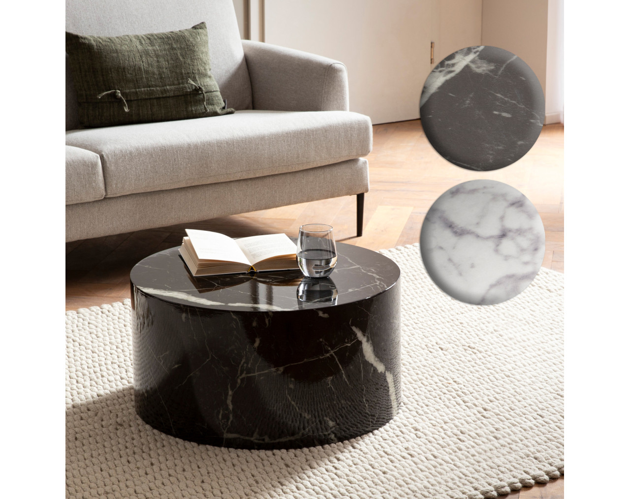 Design Eleganter Couchtisch in zeitlosem Design Tisch in schlichter, runder Form Rundum mit ausdrucksstarker Marmoroptik Abmessungen Breite: 60 cm Tiefe: 60 cm Höhe: 30 cm Materialstärke: 1,8 cm Besonderheiten Runde Ablagefläche bietet Platz für Fernbedienung, Handy, Zeitschriften und Co. Aufgrund des Designs lässt sich der Tisch in vielen Zimmern einsetzen Edles Flair dank der durchgehenden Marmoroptik Kunststoffkappen an der Unterseite schützen Deinen Boden vor unschönen Kratzern Tisch ist unten geschlossen Die Maximalbelastbarkeit liegt bei ca. 25 kg Material Kompletter Tisch: foliertes MDF (mit Klarlack-Beschichtung) Lieferumfang Ein Couchtisch ohne Dekoration Montage Lieferzustand: komplett montiert und sicher verpackt Pflegehinweise Die Oberfläche mit einem lauwarm angefeuchteten Baumwolltuch reinigen. Keine Scheuermittel, scharfen Reinigungsmittel oder tropfnasse Tücher verwenden.