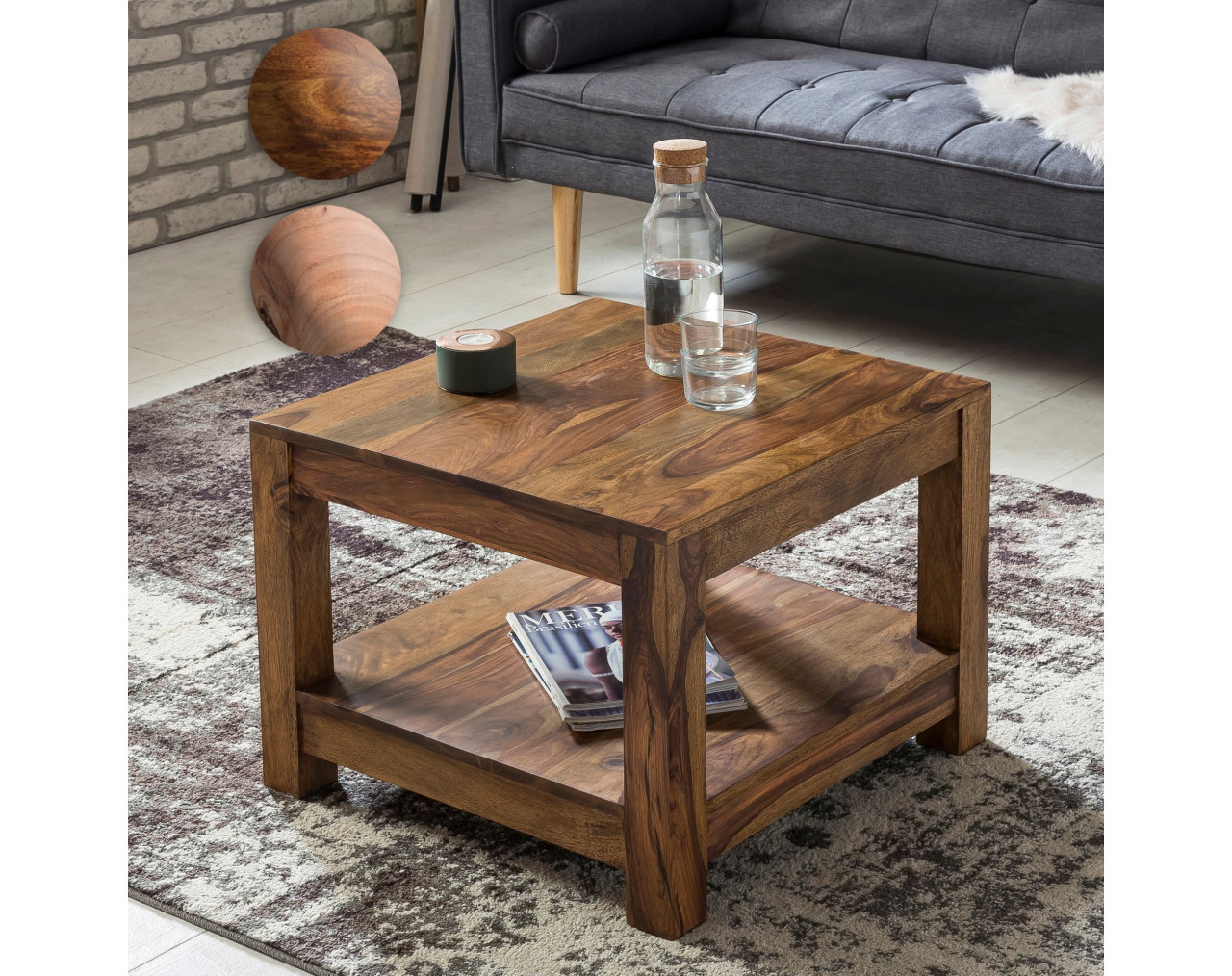Design Moderner Couchtisch in klassischem Design Stilvolle Maserung sorgt für warmes Ambiente Praktisches Ablagefach Quadratische Form Abmessungen Länge: 60 cm Höhe: 45 cm Breite: 60 cm Höhe Zwischenraum: 27 cm Füße: 6 x 6 cm Besonderheiten: Kleinere Risse, Astlöcher und Farbunterschiede sind typisch für Massivholz, da es sich um ein Produkt der Natur handelt Jeder Tisch ist von Hand gefertigt - dadurch kann es zu Unebenheiten kommen, die jeden Couchtisch zu einem Unikat machen Material Kompletter Tisch: Massivholz Lieferumfang 1 Couchtisch Lieferung ohne Dekoration Montage Lieferzustand: Montiert Pflegehinweise: Die Oberfläche mit einem lauwarm angefeuchteten Baumwolltuch reinigen Keine Scheuermittel, scharfe Reinigungsmittel oder tropfnasse Tücher verwenden Keine weitere Behandlung der naturbelassenen Oberfläche (Ölen, Wachsen) notwendig
