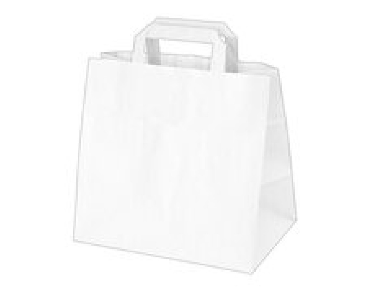 -Papiertragetaschen aus Kraftpapier in weiß -mit innenliegenden Flachhenkeln -mit EAN-Code auf der Bodenfalte - zum einfachen Erfassen in Ihrem Warenwirtschaftssystem -umweltbewußt -platzsparende Lagerung -mehrfach verwendbar -Grammatur: 70 g/m2 -Abmessungen: Höhe 25 cm, Breite 26 cm, Tiefe 17 cm -Inhalt: 250 Stk.