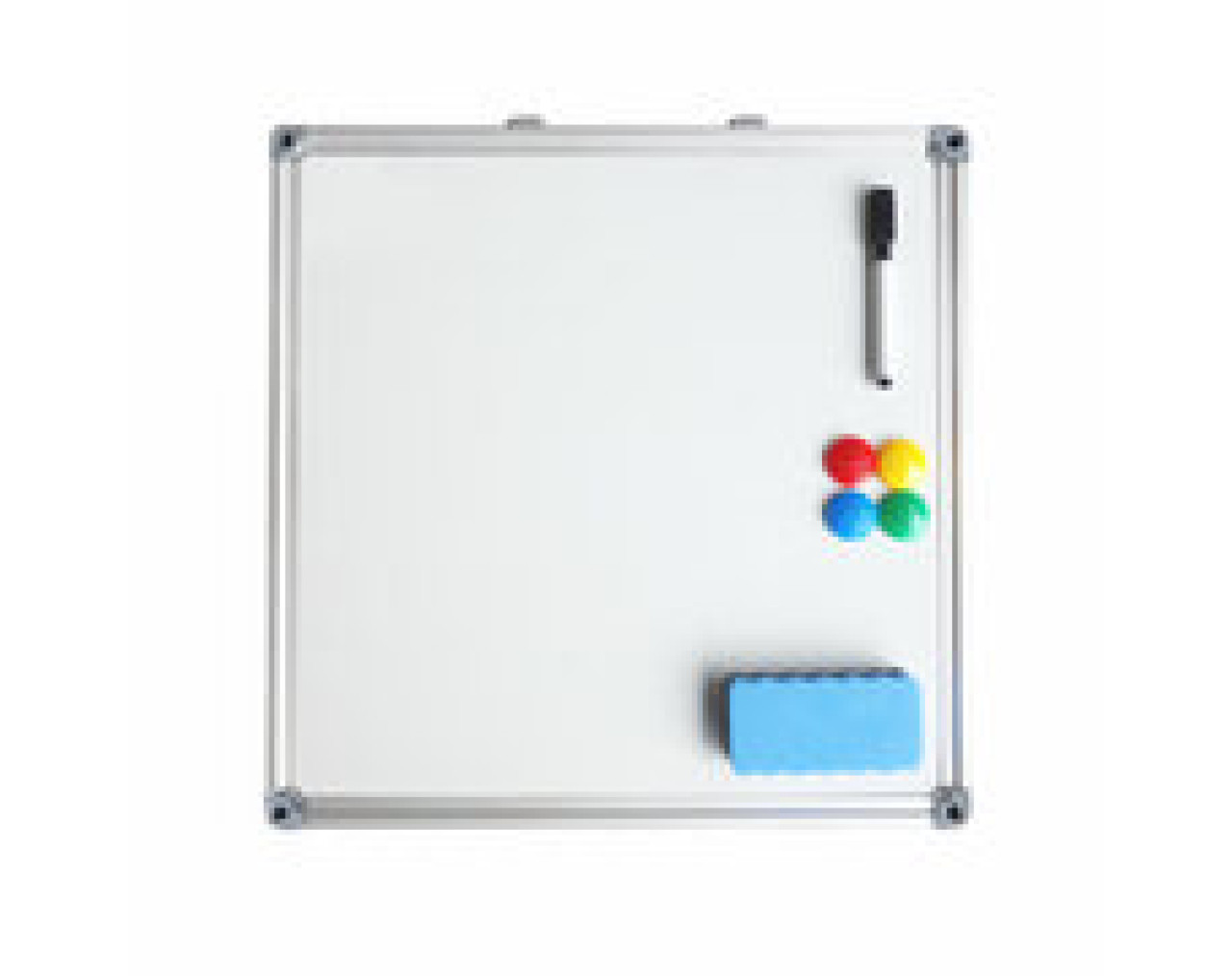 Whiteboard Magnettafel, 40 x 40cm, mit Alurahmen Egal ob für private oder berufliche Verwendung, unser Whiteboard hilft Ihnen bei der übersichtlichen Präsentation. Notizen, Termine, Mindmaps oder To-do-Listen können somit schnell visualisiert werden. Zusätzlich können Fotos, Pläne und Memozettel mit den gelieferten Magneten befestigt werden. Danach können nicht mehr benötigte Beschriftungen problemlos mit dem Schwamm abgewischt werden. Eigenschaften: -Befestigung von Notizen mit Hilfe von Magneten möglich -Schrift lässt sich einfach trocken oder feucht abwischen -Befestigung: leichte Montage mit 2 Wandanker an der Rückseite -Größe: 40x40cm -Gesamtdicke: ca. 7 mm -Gewicht: 0,815kg -Farbe: weiß -Inhalt: 1x Whiteboard, 1x Zeichenstift, 1x Schwamm, 4x Magnete