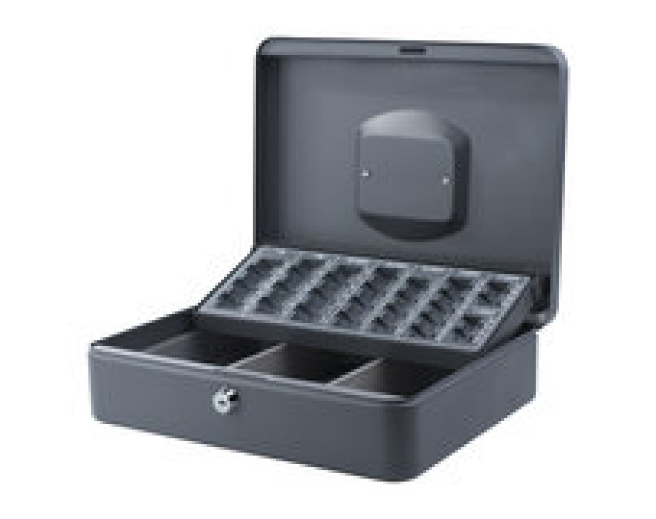 Geldkassette aus robustem Stahl, mit Sicherheits- Zylinderschloss und herausnehmbarem Zählbrett Die handliche Geldkassette ist der ideale Ort, um Münzen und Scheine übersichtlich aufzubewahren. Durch das integrierte Zählbrett haben Sie schnellen Zugriff auf die verschiedenen Münzen - ganz ohne Suchen. Das Zählbrett stellt sich automatisch beim Öffnen auf und erleichtert Ihnen die Arbeit beim Zählen. Der Geldscheineinsatz besitzt 3 Scheinfächer und ist auch herausnehmbar. -gefertigt aus nahtlos gezogenem und pulverbeschichtetem Stahlblech -ideal für den Barverkauf an Märkten und Ständen -mit Sicherheits- Zylinderschloss mit 2 Schlüsseln -inkl. praktischem Tragegriff im Deckel versenkbar -herausnehmbares Zählbrett für Münzen: 2 euro (35x),1 euro (35x), 50 cent (35x), 20 cent (40x), 10 cent (40x), 5 cent (50x), 2 cent (20x) und 1 cent (20x) -herausnehmbarer Geldscheineinsatz mit 3 Fächern -Außenabmessungen der Geldkassette: ca. 300 x 235 x 95mm -Größe des Zählbrettes: 270 x 110 mm -Größe des Geldscheineinsatzes: 295 x 230 mm -Farbe: dunkelgrau