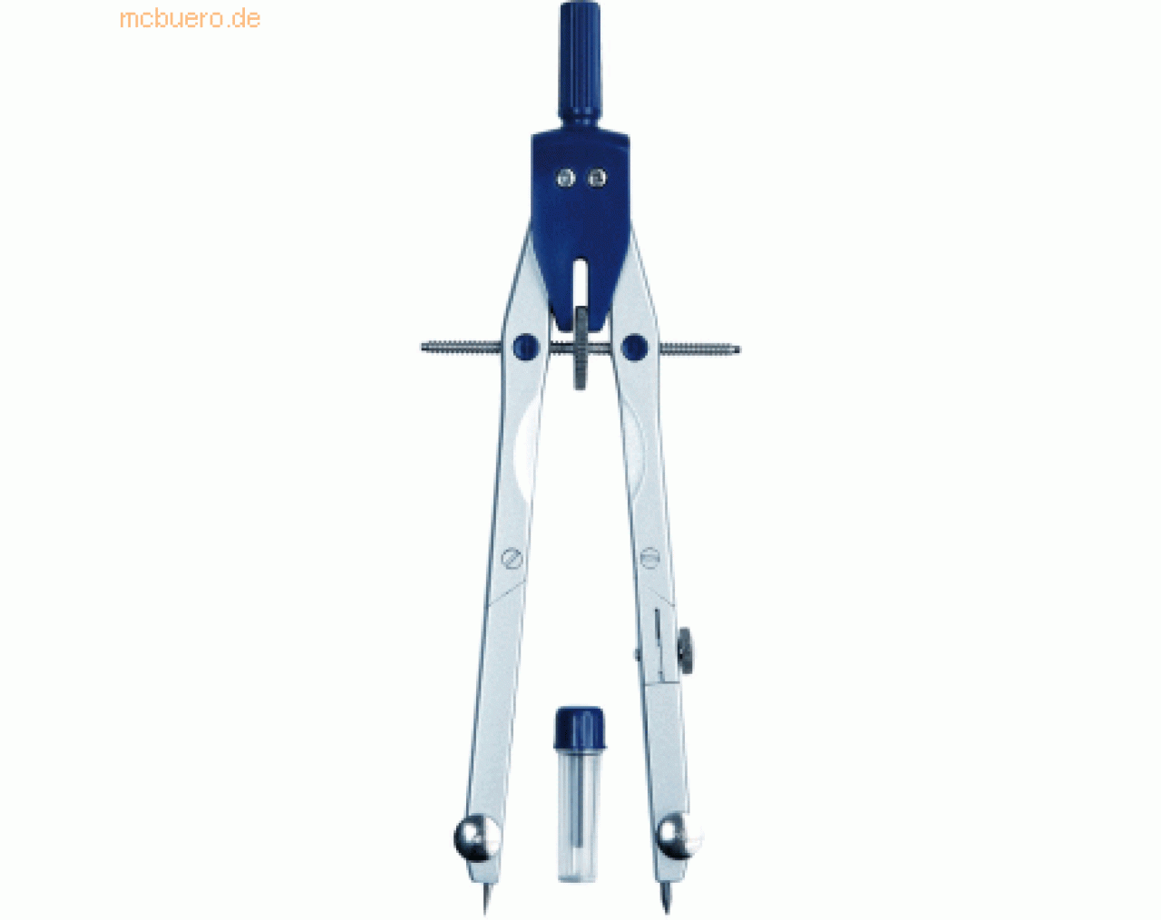 Aus Zink und Kunststoff mit Feineinstellung durch Mittelradspindel; 2 asymetrische Kniegelenke; Zirkeleinsätze auswechselbar; mit Minenbüchse; Kreis-Durchmesser: 380 mm; Länge: 170 mm; Farbe: silber, Kopf schwarz; Hartplastiketui mit Eurolochung;