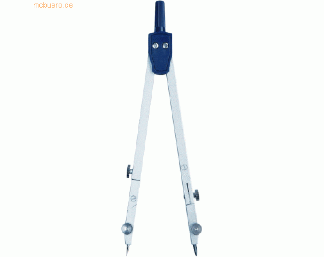 Aus Zink und Kunststoff mit Zahnradgeradeführung Knie- und Nadelgelenk; Zirkeleinsätze auswechselbar; Kreis-Durchmesser: 500 mm; Länge: 155 mm; Farbe: silber, Kopf schwarz; Hartplastiketui mit Eurolochung;