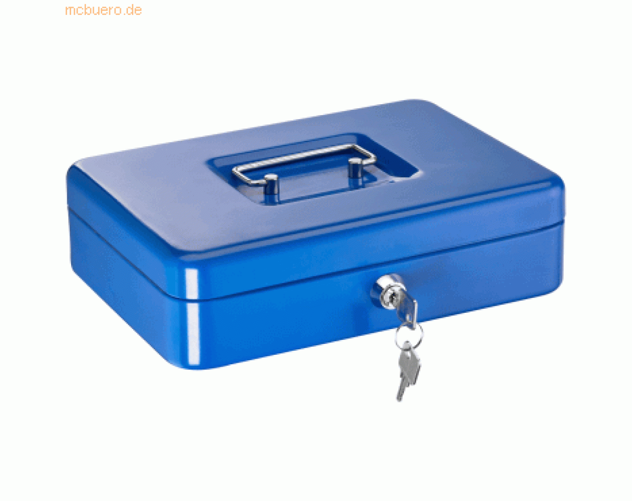 Aus Stahlblech; Einsatz aus Kunststoff; innen und außen kratzfest lackiert verchromtes Drehriegel-Zylinderschloss mit 2 Schlüsseln; Größe (B x T x H): 250 x 170 x 75 mm; Farbe: blau;
