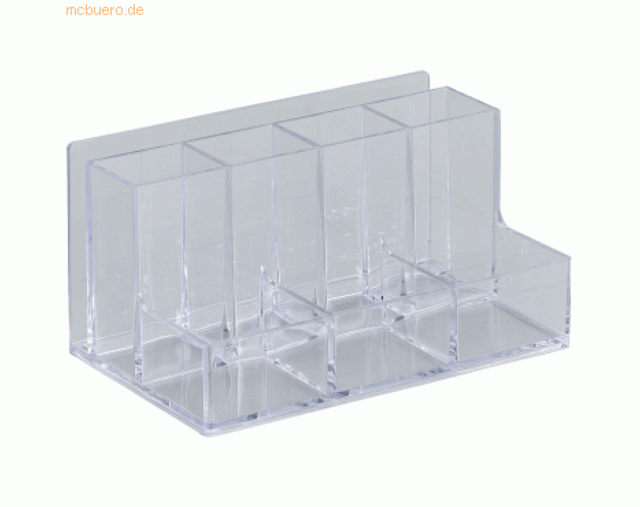 8 Fächer: 4 Fächer für Stifte, Briefständer, 3 Klammerfächer; aus Acryl; Größe: 155 x 75 x 95 mm (B x T x H); Farbe: glasklar;