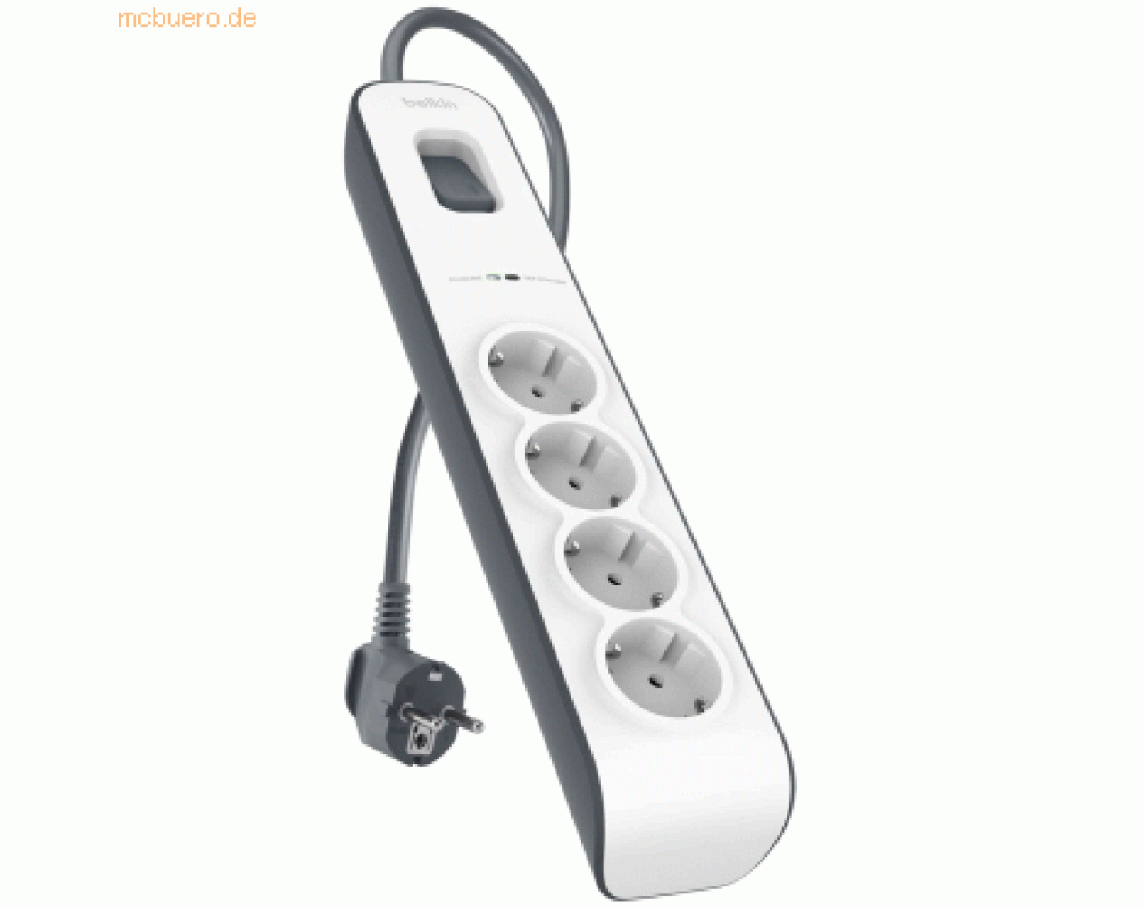 Mit dem Belkin Surgemaster Überspannungsschutz schützen Sie Ihre Geräte vor gefährlichen Überspannungen. Die Überspannungsschutz-Steckdosenleiste wird an eine Steckdose angeschlossen. Dann können bis zu vier Geräte, die geschützt werden sollen, angeschlossen werden. Die Steckdosenleiste ist dafür ausgelegt, bis zu 525 Joule standzuhalten und eignet sich somit perfekt für Laptop, Desktop-Computer, Drucker, Router und andere Geräte in Ihrem Home-Office.> Highlights- Bietet Elektronikgeräten im Heimbüro Schutz vor gefährlichen Überspannungen und Spannungsspitzen- Ideal für Laptops, Desktop-Computer, Drucker, Router und andere Geräte in Ihrem Home-Office- Vier geschützte Steckdosen- 2-m-Netzkabel zum unauffälligen Verstauen der Steckdosenleiste- Robustes Gehäuse bietet Schaltungen Schutz vor Brand, Stößen und Rost- Ausgelegt, um Energiestößen von bis zu 525 Joule standzuhalten- Dreileiterschutz gegen Überspannungen, die zwischen Phasen-, Neutral- und Erdleiter auftreten können> Produkttyp- Stecker/Verbinder- ear-Kategorie (ElektroG): relevant, Kategorie 6: kleine Geräte der IT- und TK-Technik, Kleine Geräte der IT- und TK-Technik B2C> Versand- WEEE: 36706037> Grundeigenschaften- Farbe: Weiß> Lieferumfang- Belkin Surgemaster Überspannungsschutz, 4-Fach, 2m