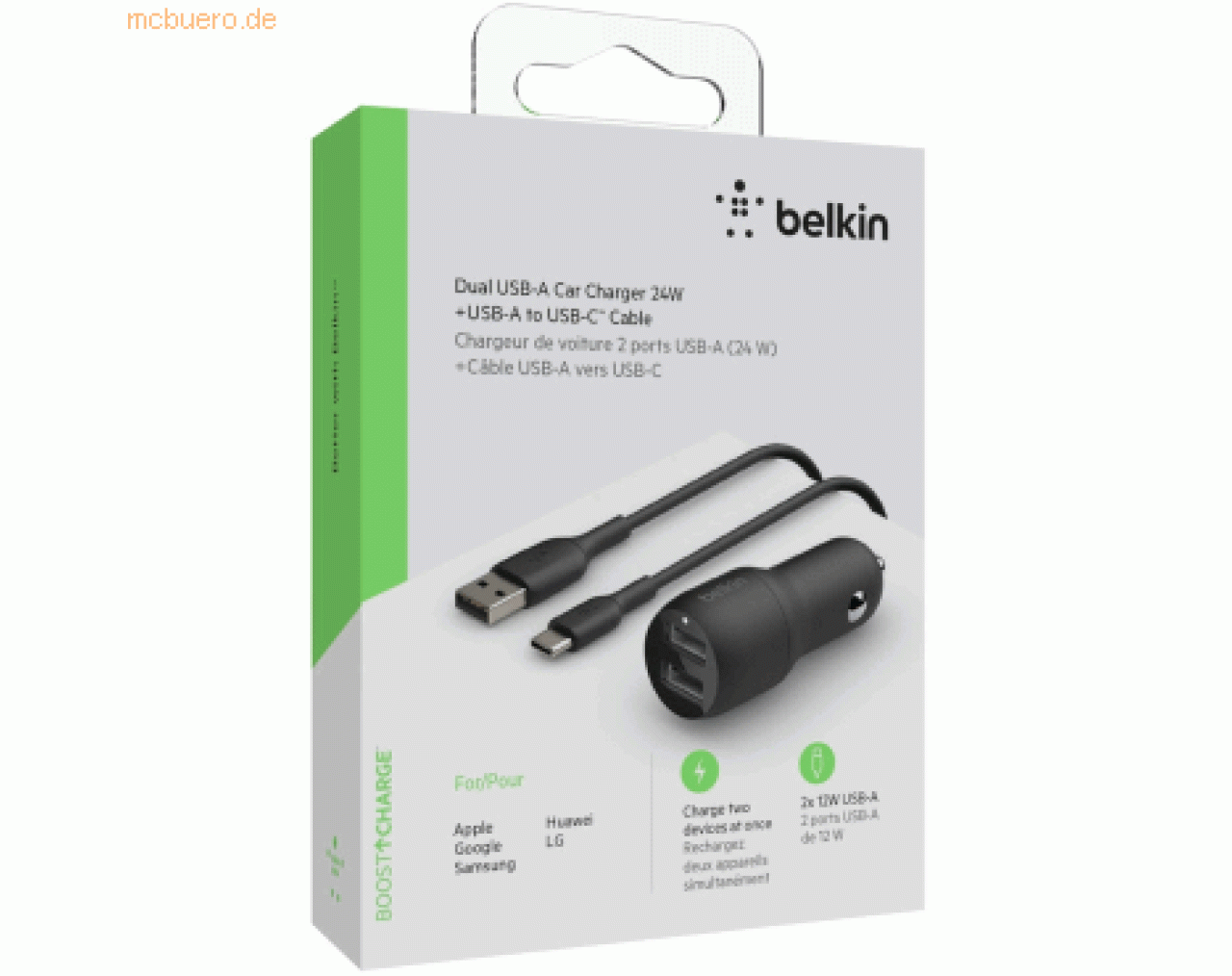 24W Autoladegerät mit 2 USB-A Anschlüssen und mitgeliefertem USB-C-Kabel> Highlights- Belkin Dual USB-A Kfz-Ladegerät incl. USB-C Kabel- Exklusives, hochwertiges Design- Schnelles Aufladen möglich- Gleichzeitiges Aufladen von 2 Geräten möglich- 2 USB-A Anschlüsse> Produkttyp- Akkuladegerät- ear-Kategorie (ElektroG): relevant, Kategorie 5: Kleingeräte < 50 cm (alle Seiten), Kleingeräte B2C> Versand- WEEE: 36706037> Stromversorgung- Ausgangsanschlüsse: USB-A, USB-C- Schnellladen: Power Delivery (PD)- Leistungsabgabe: 30 W> Kabel- Kabellänge: 1 m> Grundeigenschaften- Farbe: Schwarz> Lieferumfang- Belkin Dual USB-A Kfz-Ladegerät incl. USB-C Kabel 1m 24W black