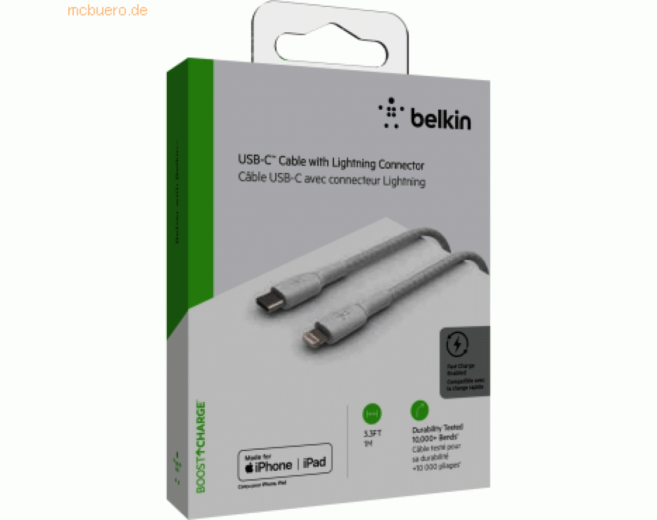 Laden und synchronisieren Sie all Ihre Geräte mit Lightning Connector schnell und sicher mit nur einem Kabel.> Highlights- USB-C Kabel mit Lightning Connector- Zum Laden und Synchronisieren von Daten- Kompaktes Design für unterwegs- Zum Anschluss an Laptops oder auch im Auto- Schnellladefunktion- Länge: 1 m- MFi zertifiziert- Haltbarkeitstest mit über 10.000 Biegungen- Passend für iPhone und iPad> Produkttyp- Stromkabel- ear-Kategorie (ElektroG): relevant, Kategorie 5: Kleingeräte < 50 cm (alle Seiten), Kleingeräte B2C> Spezifikationen- Kabellänge: 1 m> Versand- WEEE: 36706037> Grundeigenschaften- Farbe: Weiß> Lieferumfang- Belkin Lightning/USB-C Kabel ummantelt mfi 1 m