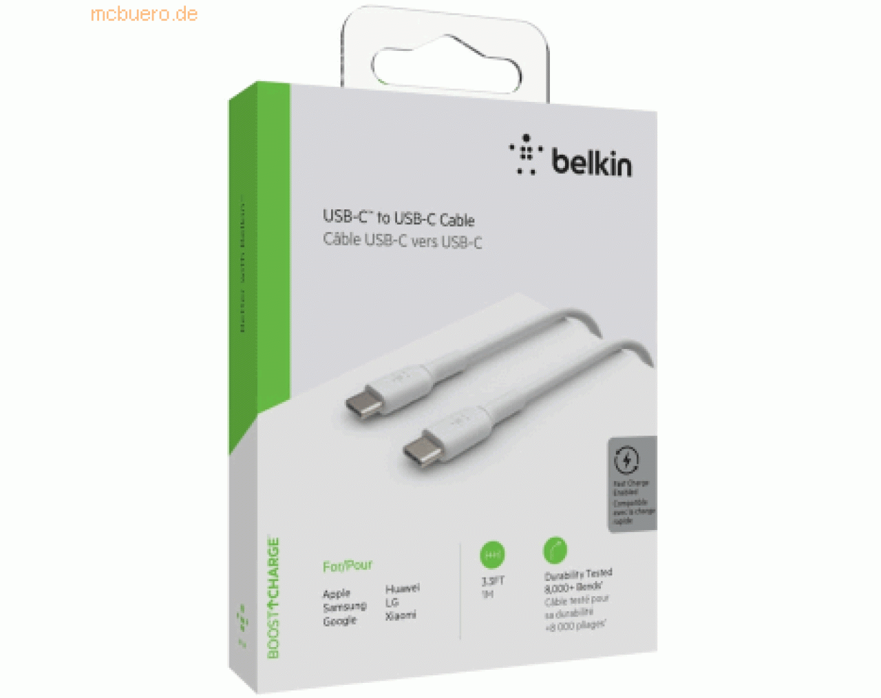 Das USB-C-/USB-C-Kabel kann zum Aufladen oder Synchronisieren von Fotos, Musik und Daten auf einem USB-C-Gerät mit Ihrem Laptop verwendet werden. Stecker mit dem Standard USB-C sind besonders benutzerfreundlich, da sie verschiedene Ausrichtungen beim Anschluss von Kabeln an Geräte zulassen.> Highlights- USB-C auf USB-C Kabel- Länge: 1 Meter- Geeignet zum Laden und Datenübertragung- Ummantelte Kabel- BoostCharge- Passend für Geräte mit USB-C Anschluss> Produkttyp- Datenkabel- ear-Kategorie (ElektroG): relevant, Kategorie 6: kleine Geräte der IT- und TK-Technik, Kleine Geräte der IT- und TK-Technik B2C> Spezifikationen- Kabellänge: 1 m> Versand- WEEE: 36706037> Anschlüsse- Anschluss: USB-C> Grundeigenschaften- Farbe: Weiß> Lieferumfang- Belkin USB-C/USB-C Kabel PVC, 1m, weiß