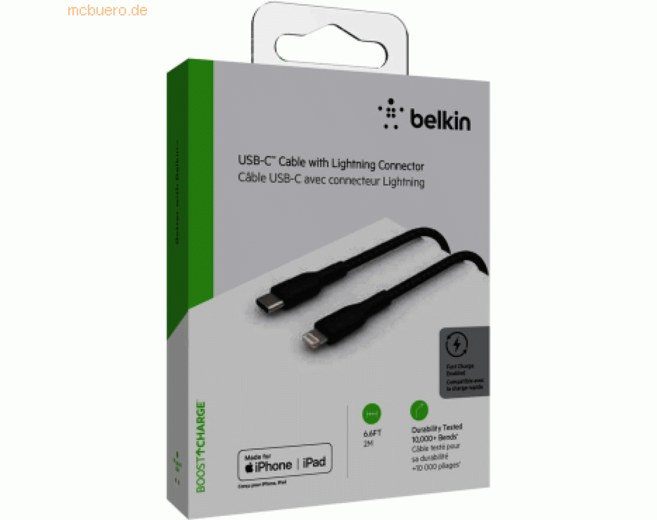Laden und synchronisieren Sie all Ihre Geräte mit Lightning Connector schnell und sicher mit nur einem Kabel.> Highlights- USB-C Kabel mit Lightning Connector- Zum Laden und Synchronisieren von Daten- Kompaktes Design für unterwegs- Zum Anschluss an Laptops oder auch im Auto- Schnellladefunktion- Länge: 2 m- MFi zertifiziert- Haltbarkeitstest mit über 10.000 Biegungen- Passend für iPhone und iPad> Produkttyp- Stromkabel- ear-Kategorie (ElektroG): relevant, Kategorie 5: Kleingeräte < 50 cm (alle Seiten), Kleingeräte B2C> Spezifikationen- Kabellänge: 2 m> Versand- WEEE: 36706037> Grundeigenschaften- Farbe: Schwarz> Lieferumfang- Belkin Lightning/USB-C Kabel ummantelt mfi 2 m