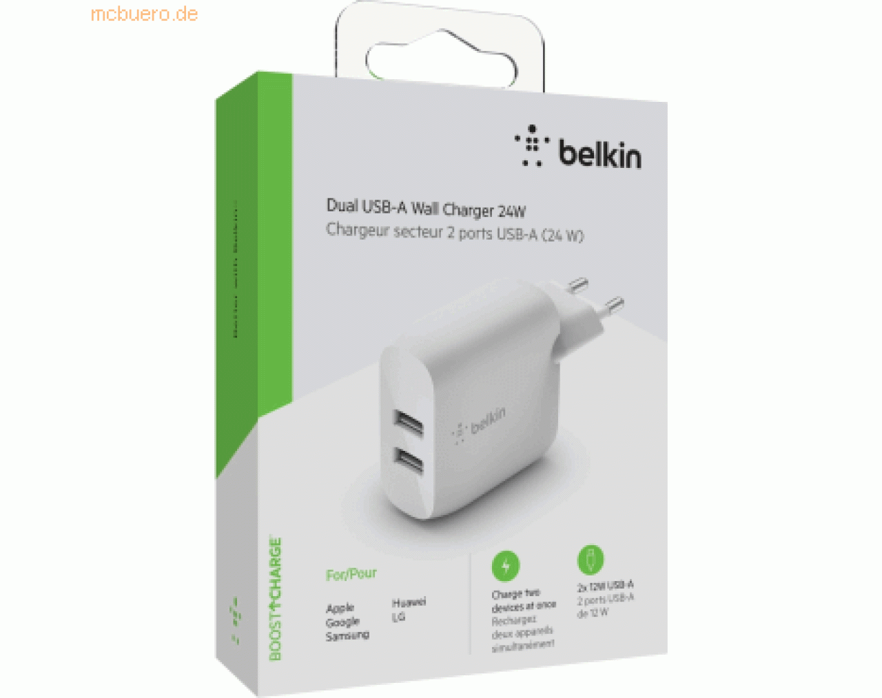 24W Ladegerät mit 2 12 Watt USB-A-Anschlüssen> Highlights- Belkin Dual USB-A Ladegerät- Exklusives, hochwertiges Design- Schnelles Aufladen- Gleichzeitiges Laden von 2 Geräten- Leistung von 24W> Produkttyp- Akkuladegerät- ear-Kategorie (ElektroG): relevant, Kategorie 5: Kleingeräte < 50 cm (alle Seiten), Kleingeräte B2C> Versand- WEEE: 36706037> Stromversorgung- Ausgangsanschlüsse: USB-A- Leistungsabgabe: 24 W> Grundeigenschaften- Farbe: Weiß> Lieferumfang- Belkin Dual USB-A Ladegerät, 24W, weiß