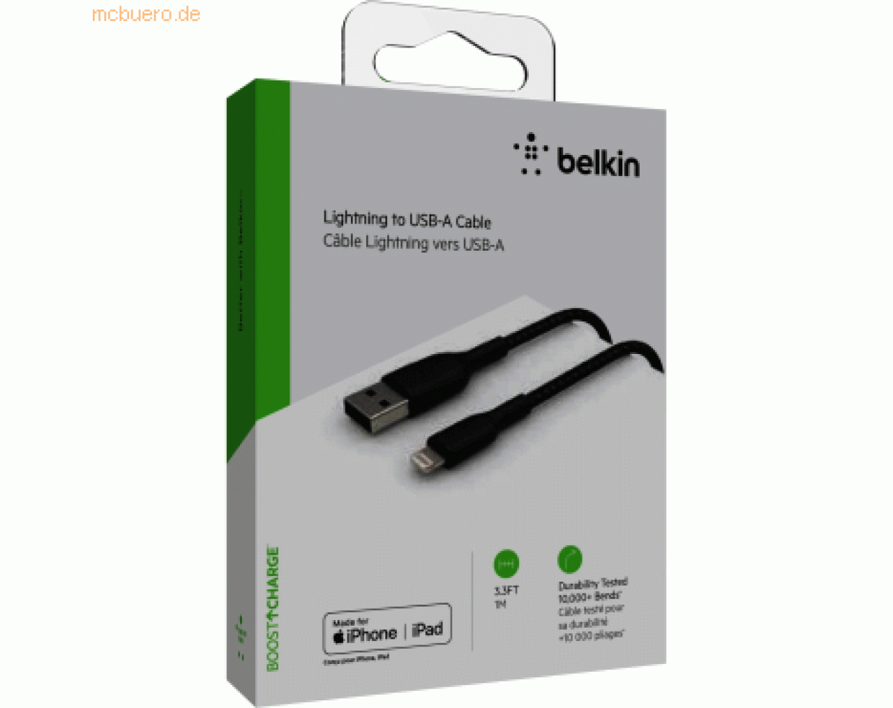 Laden und synchronisieren Sie all Ihre Geräte mit Lightning Connector schnell und sicher mit nur einem Kabel.Schließen Sie den USB-Stecker einfach direkt an einen USB-Anschluss an, um zu Hause, auf der Arbeit oder unterwegs stets in Verbindung zu bleiben.> Highlights- Lightning auf USB-A Kabel- Zum Laden und Synchronisieren von Daten- Kompaktes Design für unterwegs- Zum Anschluss an Laptops oder auch im Auto- Schnellladefunktion- Länge: 1 m- MFi zertifiziert- Haltbarkeitstest mit über 10.000 Biegungen- Passend für iPhone und iPad> Produkttyp- Datenkabel- ear-Kategorie (ElektroG): relevant, Kategorie 6: kleine Geräte der IT- und TK-Technik, Kleine Geräte der IT- und TK-Technik B2C> Spezifikationen- Kabellänge: 1 m> Versand- WEEE: 36706037> Anschlüsse- Anschluss: Lightning> Grundeigenschaften- Farbe: Schwarz> Lieferumfang- Lightning Lade/Sync Kabel ummantelt mfi 1 m