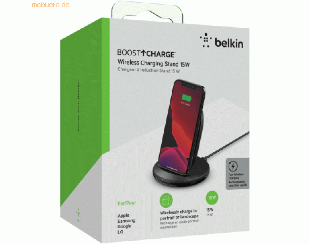 Machen Sie Schluss mit dem Kabelsalat auf dem Schreibtisch oder auf der Arbeitsplatte. Ersetzen Sie die Kabel einfach durch einen praktischen drahtlosen Ladeständer.Dieses schmale, kompakte Ladegerät lädt Ihr Apple oder Android Smartphone mit 15 W auf. Ganz besonders praktisch ist die flexible Ausrichtung. Sie können Ihr Smartphone während des Ladens zum Streamen von Videos im Querformat nutzen oder im Hochformat Rezepte lesen.Das Ladegerät eignet sich für die meisten Smartphone-Hüllen und gewährleistet nicht nur Sicherheit, da es Qi-zertifiziert ist, sondern zeigt über eine LED auch an, ob Ihr Smartphone richtig aufgeladen wird. Das praktische 15-W-Ladegerät, das gut in jede Einrichtung passt, macht nicht nur das Laden, sondern auch Ihren Alltag leichter. Quick Charge 3.0-Netzteil enthalten.> Highlights- Wireless Charging Stand mit Qi-Zertifizierung- Bequem kabellos Laden bis zu 15 W- Rutschfeste Oberfläche- Mit vielen Schutzhüllen (bis zu 3 mm dick) kompatibel- Standfunktion für Hoch- und Querformat- LED-Licht zeigt den Ladestatus an- Kompaktes Design eignet sich perfekt für Schlaf-, Wohnzimmer und Büro- Kompatibilität für Samsung, Apple, Google Pixel und LG> Produkttyp- Ladestation- ear-Kategorie (ElektroG): relevant, Kategorie 5: Kleingeräte < 50 cm (alle Seiten), Kleingeräte B2C> Versand- WEEE: 36706037> Stromversorgung- Induktives Laden: Qi- Leistungsabgabe: 15 W> Grundeigenschaften- Farbe: Schwarz> Lieferumfang- Belkin BoostCharge Wireless Charging Stand 15 W- Netzteil