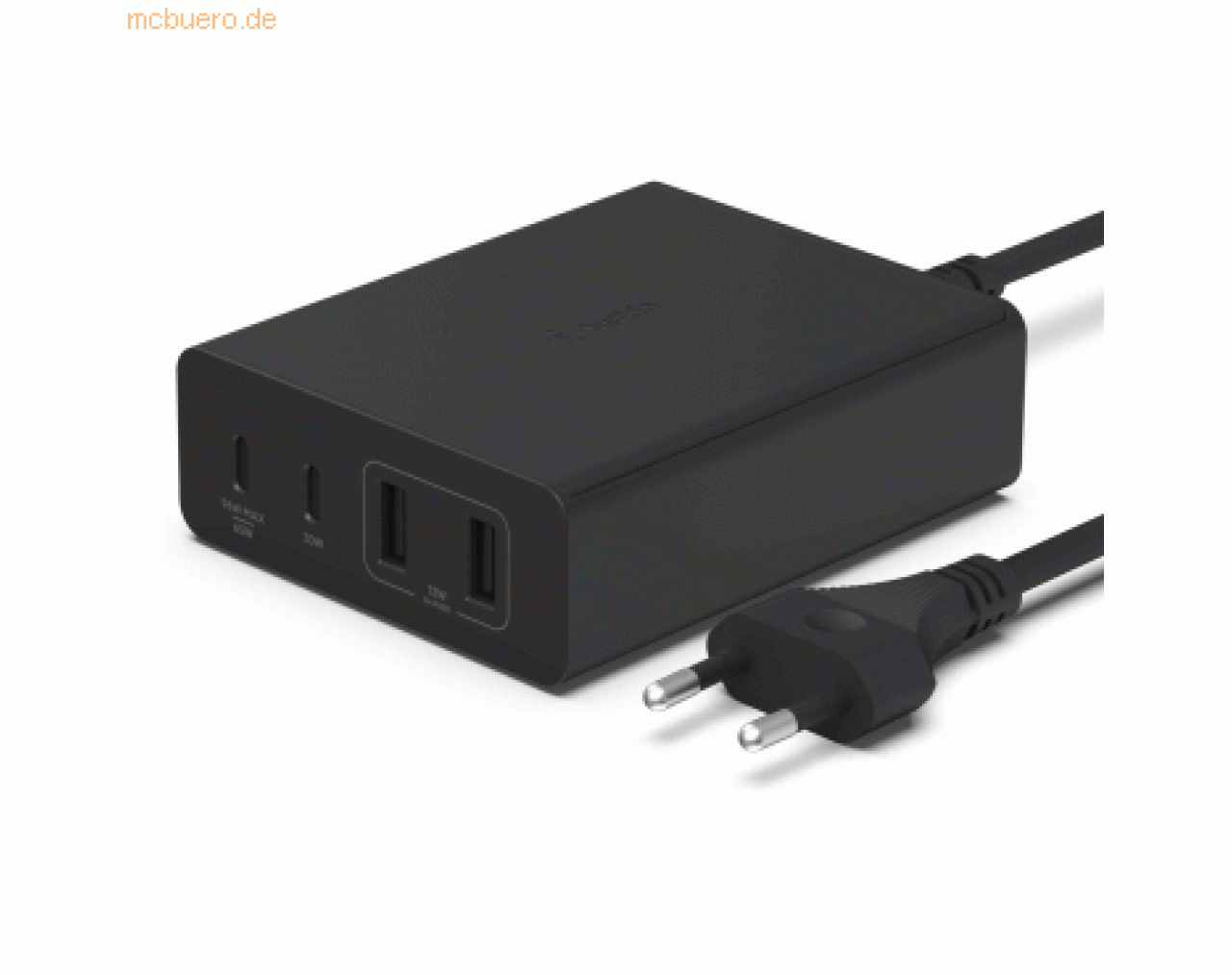Laden Sie mit dem 4-Port-USB-C-GaN-Ladegerät (108 W) von Belkin Ihr MacBook Pro mit voller Geschwindigkeit auf. Dank der zwei USB-C-Ports und der zwei USB-A-Ports können Sie Ihren Laptop, Ihr iPad, Ihr iPhone und Ihre Apple Watch einfach und bequem aufladen. Das Ladegerät unterstützt auch eine breite Palette an Samsung- und Google-Geräten sowie andere kompatible USB-C-Laptops und -Geräte. Die integrierte GaN-Technologie sorgt für eine höhere Leistung und mehr Effizienz beim Laden. Das außergewöhnliche Design ermöglicht Ihnen den komfortablen Zugriff auf mehrere Ladeanschlüsse direkt auf Ihrem Schreibtisch.> Highlights- Netzladegerät mit bis zu 108 Watt Leistung - bei Verwendung eines USB-C-Anschluss (96 W) und zweier USB-A-Anschlüsse (12 W)- Die integrierte GaN-Technologie sorgt für ein effizientes Laden mit hoher Leistung- Laden Sie über USB-C gleichzeitig ein iPad in 39 Minuten von 0 auf 50 % und ein iPhone 12 Pro in 26 Minuten von 0 auf 50 %- Ein MacBook Pro in 39 Minuten von 0 auf 50 % aufladen über USB-C- Das 2 Meter lange Netzkabel ermöglicht eine einfache Platzierung auf Schreibtisch, Nachttisch und an anderen Orten- Dank intelligenter Verteilung der Leistung wird der Strombedarf erkannt und die geeignete Leistung auf bis zu 4 Geräte verteilt- Das Universal-Ladegerät funktioniert mit Apple, Samsung, Windows und anderen kompatiblen USB-C-Laptops und -Geräten> Produkttyp- Akkuladegerät- ear-Kategorie (ElektroG): relevant, Kategorie 5: Kleingeräte < 50 cm (alle Seiten), Kleingeräte B2C> Versand- WEEE: 36706037> Anschlüsse- USB: 2- USB-C: 2> Stromversorgung- Ausgangsanschlüsse: USB-A, USB-C- Steckertyp: Eurostecker (Typ C CEE 7/16)- Schnellladen: Power Delivery (PD)- Leistungsabgabe: 108 W> Kabel- Kabellänge: 2 m> Grundeigenschaften- Farbe: Schwarz- Herstellerfarbbezeichnung: Black- Höhe: 31.5 mm- Länge/Tiefe: 98.5 mm- Breite: 80 mm> Lieferumfang- Belkin 108 W 4-Port GaN Ladegerät- Netzkabel