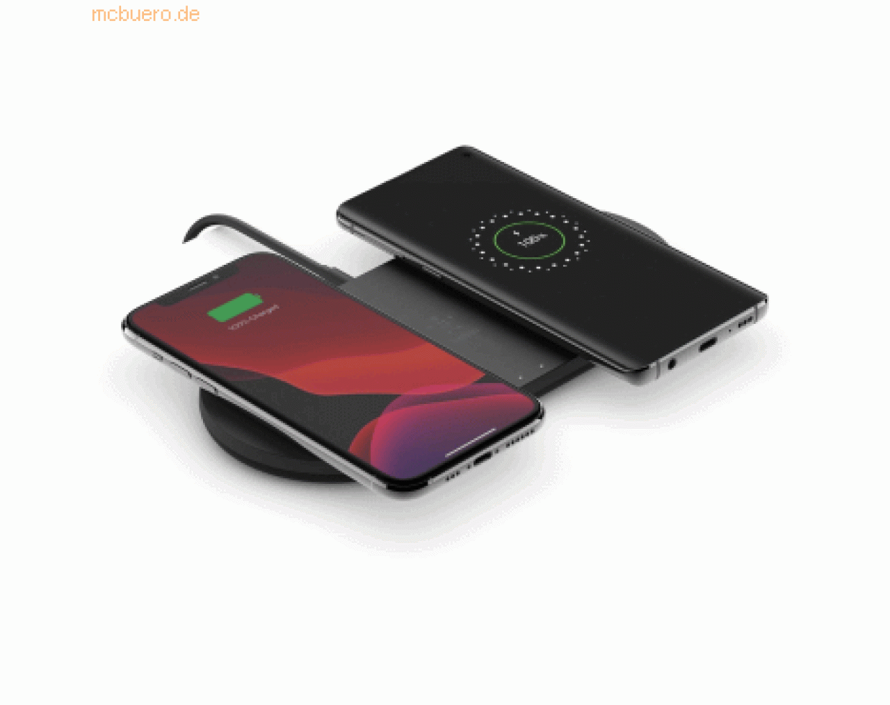 Zwei Geräte können mit bis 15 Watt gleichzeitig und schnell drahtlos aufgeladen werden.Dieses Ladegerät, das gut ins Wohnzimmer oder Büro passt, ist eine perfekte Lösung, wenn zwei Geräte gleichzeitig einen schnellen Energieschub brauchen, etwa zwei Smartphones oder ein Smartphone und drahtlose Ohrhörer.Sie können damit sowohl Android- als auch iOS-Geräte schnell drahtlos aufladen. Hierzu brauchen Sie Ihr Smartphone nicht einmal aus der Hülle zu nehmen.Auf der rutschfesten Oberfläche werden zudem Fremdkörper erkannt, um einen reibungslosen Betrieb zu ermöglichen.> Highlights- Zwei Pads Gleichzeitig- Auf den zwei Pads können Sie zwei Geräte gleichzeitig mit 15 W aufladen. Deshalb eignet sich dieses Ladegerät perfekt zum Aufladen Ihres Smartphones und Kopfhörern wie AirPods oder zur Verwendung in gemeinsam genutzten Räumen.- Drahtlos- Sie legen Ihr Smartphone einfach auf das Pad, ohne sich mit Kabeln herumschlagen zu müssen.- Optimierter Ladevorgang- Der Ladevorgang ist so optimiert, dass weniger Zeit zum drahtlosen Laden von Samsung- und iPhone-Geräten benötigt wird.- Funktioniert auch mit Hülle- Leichte Kunststoffhüllen von bis zu 3 mm brauchen zum Laden nicht einmal abgenommen zu werden.- LED-Anzeige- An einer LED können Sie nicht nur den Ladestand ablesen, sondern sehen auch, wenn sich Fremdkörper auf der Oberfläche befinden.- Rutschfeste Oberfläche- Dank der rutschfesten Oberfläche kann das Smartphone sicher an Ort und Stelle aufgeladen werden.> Produkttyp- Ladestation- ear-Kategorie (ElektroG): relevant, Kategorie 5: Kleingeräte < 50 cm (alle Seiten), Kleingeräte B2C> Versand- WEEE: 36706037> Stromversorgung- Induktives Laden: Qi- Leistungsabgabe: 10 W> Grundeigenschaften- Farbe: Schwarz> Lieferumfang- Drahtloses Ladegerät mit zwei Ladepads- Netzteil
