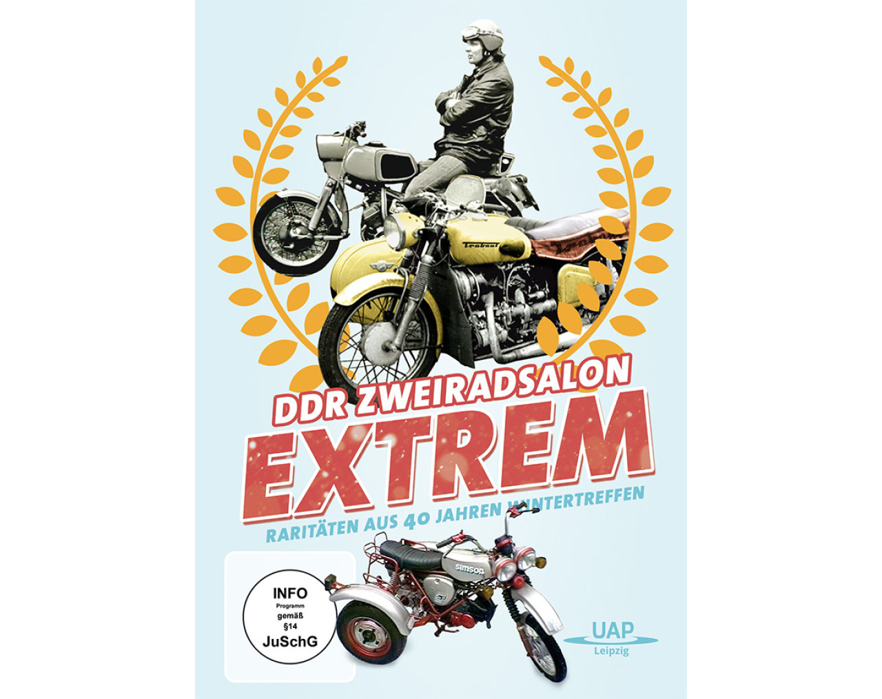 DDR Zweiradsalon Extrem stellt Fahrzeugraritäten aus 40 Jahren vor. Schneewehen versperren den Weg. Die Kälte lässt jeden Zweiradfahrer erstarren. Hier auf der Augustusburg präsentieren die eisenharten Biker, was sich aus einem Motor und einigen Rädern an imposanten Feuerstühlen zusammenbauen lässt. Natürlich zelten sie in diesen frostigen Tagen mittelalterlich neben ihren PS-starken Eisenrössern und fachsimpeln in abenteuerlichen Geschichten bis dass der TÜV sie scheidet.