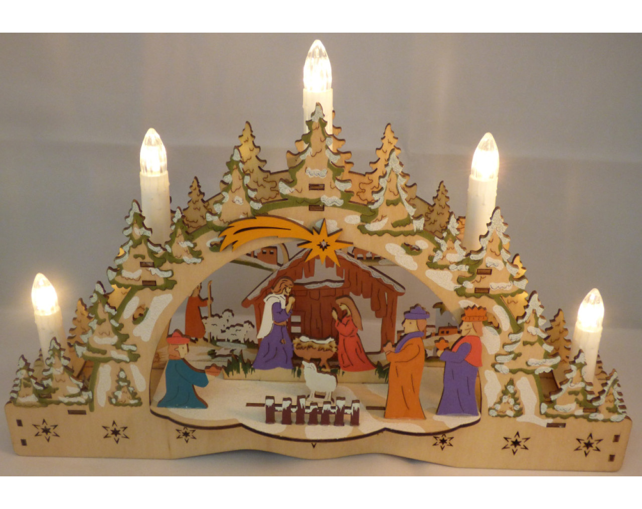 Unser detailgetreu gearbeiteter Kerzenleuchter aus Holz zeigt die Geburt des Jesuskinds im Stall von Bethlehem. Beleuchtet wird das farbig gestaltete Szenario von fünf elektrischen Kerzen. Freuen Sie sich auf eine malerische Winterlandschaft, die Sie die ganze Adventszeit lang bestaunen können! Maße: 35 x 10 x 15 cm.