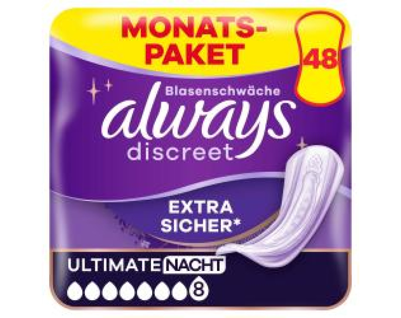 Always Discreet Ultimate Nacht Inkontinenzeinlagen für Frauen Monatspaket 48 St.