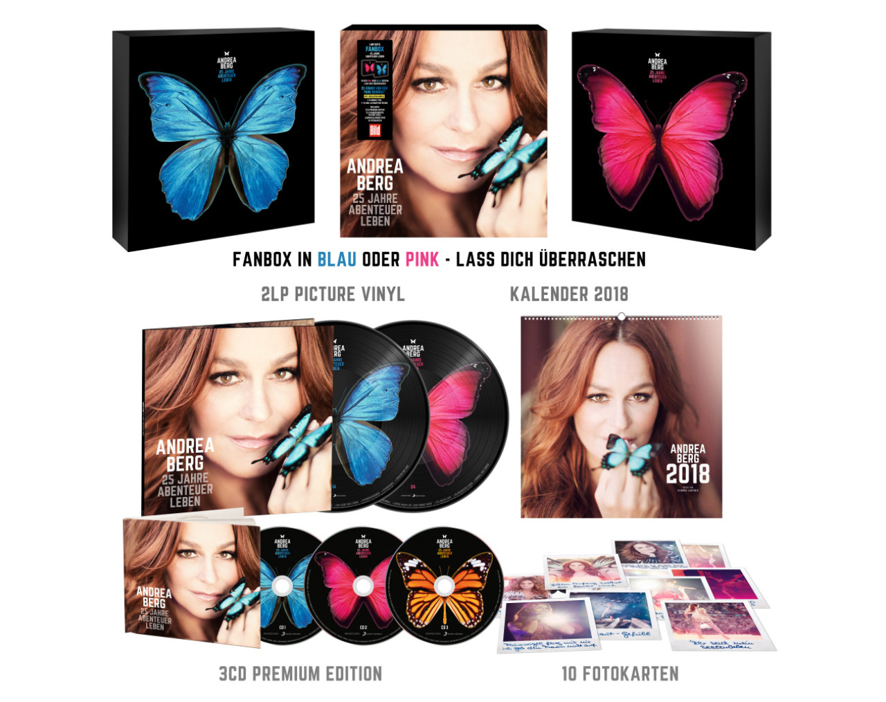 25 Jahre Abenteuer. 25 Jahre Leben. 25 Jahre die größten Hits. 25 Jahre Erfolge, wie niemand sonst: neun Nr. 1 Alben, sechs Alben hintereinander auf Platz 1, ihr Best Of ist das am häufigsten in den offiziellen Deutschen Charts platzierte Album aller Zeiten, das letzte Album Seelenbeben erreichte innerhalb von 48 Stunden Goldstatus. Das Album wurde das erfolgreichste Album einer Künstlerin in 2016 und ANDREA BERG bekam ihren achten ECHO im Laufe ihrer Karriere. Und nun zieht die Künstlerin mit 25 Jahre Abenteuer Leben eine Bilanz einer spektakulären Karriere. Eine Doppel-CD, ein wahres Feuerwerk, wie Andrea es liebt, ein Sammlerstück und zeitgemäßer Hitsampler gleichzeitig! 25 Songs von den Fans gewählt und mehr noch: Zwölf zusätzliche Tracks der Doppel-CD sind wahre Leckerbissen für die Fans. Spektakulär – zum ersten Mal veröffentlicht ANDREA BERG ihren allerersten Song „Ich werde nie wieder weinen“ von Eugen Römer. Vor 25 Jahren hatte sie ihn erstmals eingesungen. Eine rare Kostbarkeit für Berg-Fans! Damit nicht genug, zehn Akustik Versionen wurden im Studio völlig neu aufgenommen. Teils intime, völlig neu arrangierte Produktionen mit Akustikgitarren, Kontrabass, Piano, Schlagzeug und Percussion. Hautnah, ungefiltert. Andere berühmte Tracks bestechen durch Remixe und ein Juwel auf dem Album und wohl das aktuelle Highlight für alle Fans ist die Erstveröffentlichung des Songs „Ja ich will“: Eine – der Widerspruch sei gestattet – tief berührende Ballade, die doch unendlich fröhlich stimmt. Inhalte Fanbox: Hochwertige Box im Schmetterlings-Design in Vinylgröße (Wird in zwei verschiedenen Farben nach Zufallsprinzip ausgeliefert!) + 3er CD Premium Edition im hochwertigen Ecolbook mit vielen Fotos und Fan Erlebnissen + handsignierte Doppel Picture Vinyl + Wandkalender 2018 + 10er-Set Fotokarten