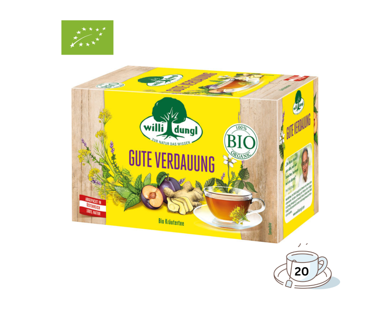 Willi Dungl Bio Tee Gute Verdauung, Kräutertee,20 Teebeutel im Kuvert Kräutertee Netto Füllmenge Bruttogewicht 79.00 Gramm,Nettogehalt 40.00 Gramm Allergene Aufbewahrung Vor Wärme geschützt und trocken lagern Zutaten Fenchel Pfefferminze Süße Brombeerblätter Ingwer Zwetschkensaftgranulat Nährwerte pro 100g Zubereitet 1 Portion, Energie 2,00 kcal, Energie 9,00 kJ, Fett 0,00 g, davon gesättigte Fettsäuren 0,00 g, Kohlenhydrate 0,40 g, davon Zucker 0,00 g, Eiweiß 0,00 g, Salz 0,00 g , Zubereitet 100 Milliliter, Energie 1,00 kcal, Energie 4,00 kJ, Fett 0,00 g, davon gesättigte Fettsäuren 0,00 g, Kohlenhydrate 0,20 g, davon Zucker 0,00 g, Eiweiß 0,00 g, Salz 0,00 g Ursprungsland ÖSTERREICH Verwendung Sieden - Zubereitung der Speise in kochendem Wasser Teebeutel unbedingt mit frischem, sprudelnd kochendem Wasser aufgießen (200 ml) und 5 Minuten ziehen lassen. Marke WILLI DUNGL Hersteller Name: Teekanne GmbH,Adresse: Münchner Bundesstraße 120, A-5020 Salzburg