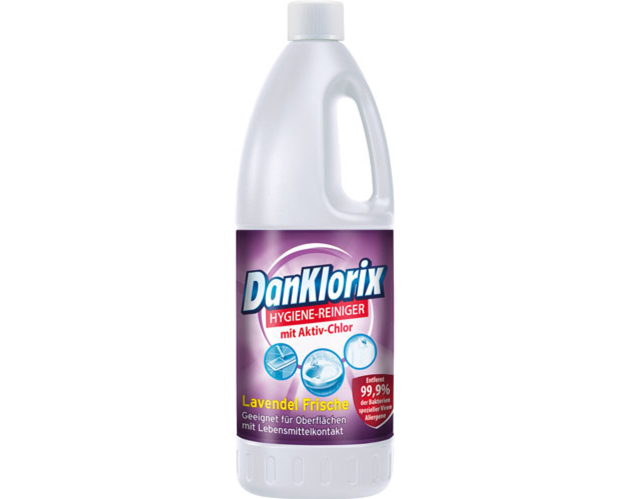 DanKlorix Hygiene-Reiniger Lavendel Frische, entfernt 99,9 % Bakterien, 1,5l Mit Aktiv-Chlor - Zum Reinigen, Desinfizieren und Entfärben, auch geeignet für Oberflächen mit Lebensmittelkontakt. Kraftvoll und vielseitig einsetzbar von Haus bis Garten. Die Wirksamkeit zur Flächendesinfektion wurde vom Verbund für Angewandte Hygiene e.V. (VAH) geprüft und bestätigt. Netto Füllmenge Bruttogewicht 1642.00 Gramm,Nettogehalt 1500.00 Milliliter Allergene Ursprungsland DEUTSCHLAND, BUNDESREPUBLIK Marke DAN KLORIX Hersteller Name: CP GABA GmbH,Adresse: Beim Strohhause 17, 20097 Hamburg