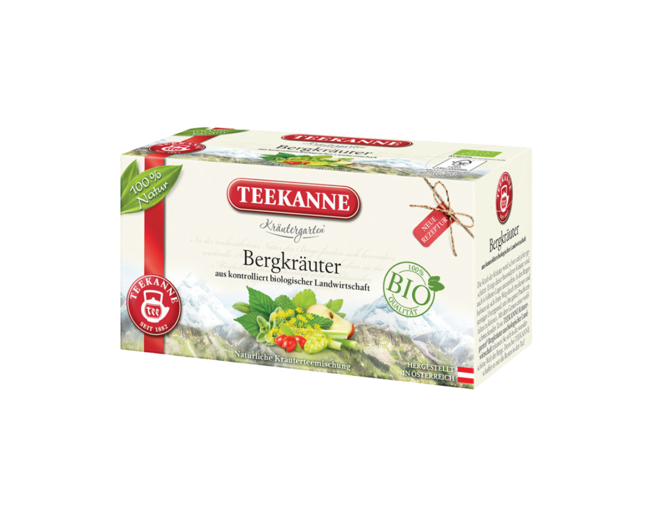 Teekanne Kräutergarten Bio Bergkräuter, 20 Teebeutel im Kuvert, 36g Kräuterteemischung Netto Füllmenge Bruttogewicht 77.00 Gramm,Nettogehalt 36.00 Gramm Allergene Aufbewahrung Vor Wärme geschützt und trocken lagern Zutaten Äpfel Krauseminze Fenchel Brombeerblätter Lemongras Melisse Hagebutten Salbei Hopfen Thymian Nährwerte pro 100g Zubereitet 1 Portion, Energie 2,00 kcal, Energie 9,00 kJ, Fett 0,00 g, davon gesättigte Fettsäuren 0,00 g, Kohlenhydrate 0,40 g, davon Zucker 0,00 g, Eiweiß 0,00 g, Salz 0,00 g , Zubereitet 100 Milliliter, Energie 1,00 kcal, Energie 4,00 kJ, Fett 0,00 g, davon gesättigte Fettsäuren 0,00 g, Kohlenhydrate 0,20 g, davon Zucker 0,00 g, Eiweiß 0,00 g, Salz 0,00 g Ursprungsland ÖSTERREICH Verwendung Sieden - Zubereitung der Speise in kochendem Wasser Teebeutel unbedingt mit frischem, sprudelnd kochendem Wasser aufgießen (200 ml) und 5 Minuten ziehen lassen. Marke TEEKANNE Hersteller Name: Teekanne GmbH,Adresse: Münchner Bundesstraße 120, A-5020 Salzburg