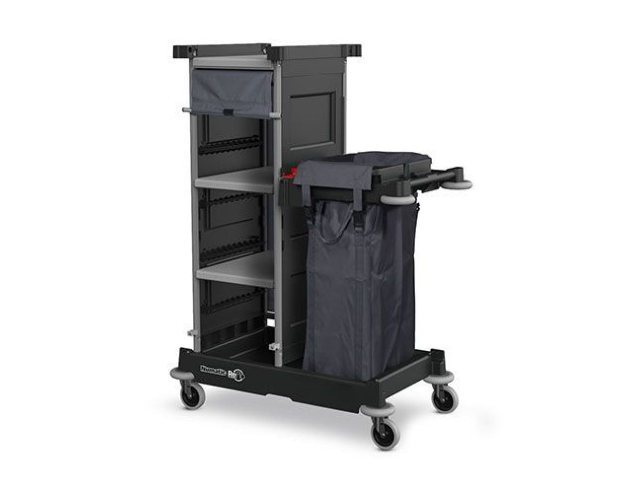 Numatic Hotelwagen NKS1R für Reinigungsarbeiten Der Numatic Hotelwagen NKS-1R ist ein kompakter und robuster Wagen, der speziell für die effiziente Wäscheentsorgung und -bestückung in Hotelbetrieben konzipiert wurde. Der NKS-1R ist mit 100-Liter-Wäschesäcken ausgestattet und wurde unter Berücksichtigung nachhaltiger Prinzipien entwickelt. Er ist SCS-zertifiziert, was bedeutet, dass mindestens 50% des verwendeten Kunststoffs recycelt sind, und unterstreicht damit Numatics Engagement für Umweltschutz und Nachhaltigkeit. Vorteile Äußerst stabiles Structofoam-Chassis: Der NKS-1R verfügt über ein besonders robustes Structofoam-Chassis, das für seine hohe Schlagfestigkeit und Langlebigkeit bekannt ist und auch intensiver Beanspruchung standhält. Erweiterbar mit Fächern für Kleinteile und Abfalleinheit: Der Hotelwagen kann optional mit zusätzlichen Fächern für Kleinteile und einer Abfalleinheit ausgestattet werden, um den individuellen Anforderungen in der Hotelreinigung gerecht zu werden und die Effizienz zu steigern. Flexibles Rollo zum Schutz vor unerwünschtem Zugriff: Das integrierte flexible Rollo schützt den Inhalt des Wagens vor unerwünschtem Zugriff und sorgt gleichzeitig für ein aufgeräumtes und professionelles Erscheinungsbild. Lieferumfang Wäschesack 100-Liter, grau Optionales Zubehör Abfalleinheit-Anbausatz 1 x 120 / 2 x 70-Liter: Set NKA-101 PR Technische Daten Laufrollen:4 x 100 mmWäschesack:100 LAbfalleinheit:optionalMaterial:Kunststoff (50 % recycelt)Abmessungen (L x B x H):998 x 582 x 1352 mmVE:1