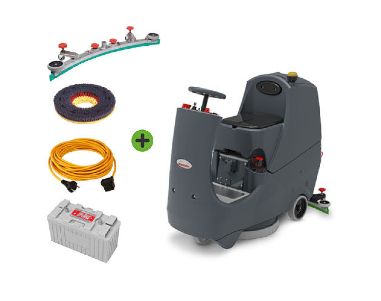 Numatic Aufsitz-Scheuersaugmaschine CRL8055 inkl. integriertes Ladegerät, 1 x SC-Bürste, 2 x NX1K Batterien Der CRL8055 liefert mühelos eine kraftvolle Reinigungsleistung in größeren Umgebungen, während er sich problemlos durch überfüllte Bereiche bewegt, indem er die klassenbeste Schrubbbreite mit einem kompakten Aufsitzdesign kombiniert. Schnelles und flexibles Aufladen ohne Beeinträchtigung der Batterieleistung, angetrieben von der neuesten Lithium-Phosphat-Technologie NX1K (Akku muss separat bestellt werden). Ein riesiges Fassungsvermögen von 80 Liter, eine Bürstendrehzahl von 150 U/min und eine Schrubbbreite von 550 mm, benutzerfreundliche Bedienelemente und ein integriertes Ladesystem sorgen für leistungsstarke Reinigungsergebnisse. Komplettes Reinigungsgerät: Vollständig einstellbare Geschwindigkeitskontrolle und einfacher Zugang zu Batterien und Sicherungen. Saubere, trockene und sichere Böden: in wenigen Minuten Hochwertige, schnelle und gleichmäßige Reinigungsergebnisse, wo immer sie benötigt werden. Länger Reinigen: Mit einem Fassungsvermögen von 80 l und einer Laufzeit von bis zu 3 Stunden sorgt der CRL8055 für eine längere Reinigungsdauer. Schnelles & flexibles Laden: Die NX1K-Technologie ermöglicht schnelles und flexibles Aufladen. Nu-Assist: Mit der Nu-Assist App haben Sie und Ihr Team rund um die Uhr und von jedem Gerät aus Zugriff auf mehrsprachige Schulungen, Fehlerbehebungs- und Wartungsinhalte und steigern so die Reinigungsproduktivität auf ganzer Linie. Vorteile 4 x längere Lebensdauer als Bleibatterien* Fortschrittliche und sichere Lithium-Phosphat-Technologie Flexibles Aufladen benutzerfreundliches Bedienelement 4000 Ladezyklen 8 Jahre Garantie** Flächenleistung: bis zu 2.200 m²/h*** Inklusivzubehör SC-Scheuerbürste rot, 550 mm Saugfuss 650 höhenverstellbar komplett (805 mm), semiparabolischLadekabel 3 x 1,0 mm², gelb2 x NX1K LiFePO4-Akku, 1280 Wh Technischen DatenFrischwasser:80 LiterSchmutzwasser:80 LiterLaufzeit:155 Min.Nennspannung:24 V 100 AhBürstmotor:300 WMotor:400 WBürstendurchmesser:550 mmPaddurchmesser:508 mmUmdrehungen:150 U/Min.Arbeitsbreite:805 mmGewicht:153 kgAbmessungen (L x B x H):805 x 1460 x 1160 mmVE:1 *Alle verwendeten Vergleiche basieren auf typischen Nutzungsszenarien, die Ergebnisse können abweichen. Die Leistungsvergleiche beziehen sich auf gleichwertige GelTec-Modelle. **Standard-Garantie 5 Jahre. 8 Jahre Garantie vorbehaltlich der Bedingungen und Marktvereinbarungen, bitte kontaktieren Sie Numatic für weitere Informationen. ***Die Flächenleistung wird mit einer Geschwindigkeit von 3 km/h bei Nachläufern und 4 km/h bei Aufsitzern berechnet.