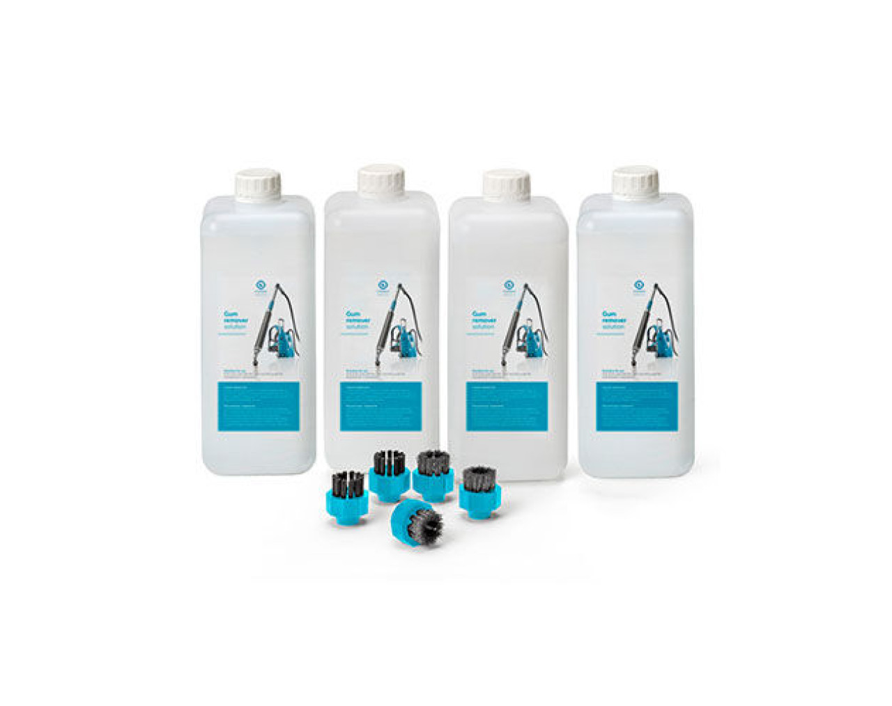 i-remove Reinigungslösung und Bürsten Day Pack Für den EInsatz eines i-remove b oder i-remove mini Kaugummientferners benötigen Sie Bürsten und die spezielle Reinigungslösung. Beides erhalten Sie hier im praktischen Day Pack. Bei der durchgehenden Anwendung verbrauchen Sie rund 2 Liter Reinigungslösung in der Stunde. Das i-remove Day Pack besteht aus: 4 x 2 Liter umweltfreundliche Reinigungslösung für i-remove Kaugummientferner. Löst effektiv Kaugummi von verschiedenen Oberflächen, ohne dabei Rückstände zu hinterlassen. 3 x Inox-Stahlbürsten, die speziell für die gründliche Reinigung von hartnäckigen Verschmutzungen wie eingetrocknetem Kaugummi entwickelt wurden. 2 x Nylonbürsten, die eine sanftere Reinigung ermöglichen und für empfindlichere Oberflächen geeignet sind. Es ist wichtig zu beachten, dass die Lösung nur mit dem i-remove-Gerät gemäß den Anweisungen des Herstellers verwendet werden sollte. Vorteile i-remove Day Pack Effektive Reinigung: Die pH-neutrale Reinigungslösung ermöglicht eine effektive Entfernung von Kaugummi und anderen hartnäckigen Verschmutzungen, ohne die Oberfläche zu beschädigen. Einfache Anwendung: Fertige Reinigungslösung in den Tank der i-remove b oder i-remove mini geben. Bürste je nach Untergrund auswählen und schon kann die Arbeit losgehen. Umweltfreundlichkeit: Die i-remove Reinigungslösung besteht zu 98 % aus natürlichen Rohstoffen und ist biologisch abbaubar. Sie ist völlig unbedenklich für die Gesundheit und die Umwelt! Zeitersparnis: Durch die Verwendung dieser Lösung können Sie Zeit und Mühe sparen, die sonst für das manuelle Entfernen von Kaugummi oder anderen Rückständen aufgewendet werden müssten. Produkteigenschaften Reinigungslösung Gebindegröße: 2 Liter Flasche Aggregatzustand: flüssig Farbe: gelb Geruch: charakteristisch pH-Wert: 7,2 Dichte (g/m²): 1 (20 °C): VE: 1 Set Pflichthinweise Nicht eingestuft gemäß der Verordnung (EG) Nr. 1272/2008 (CLP).