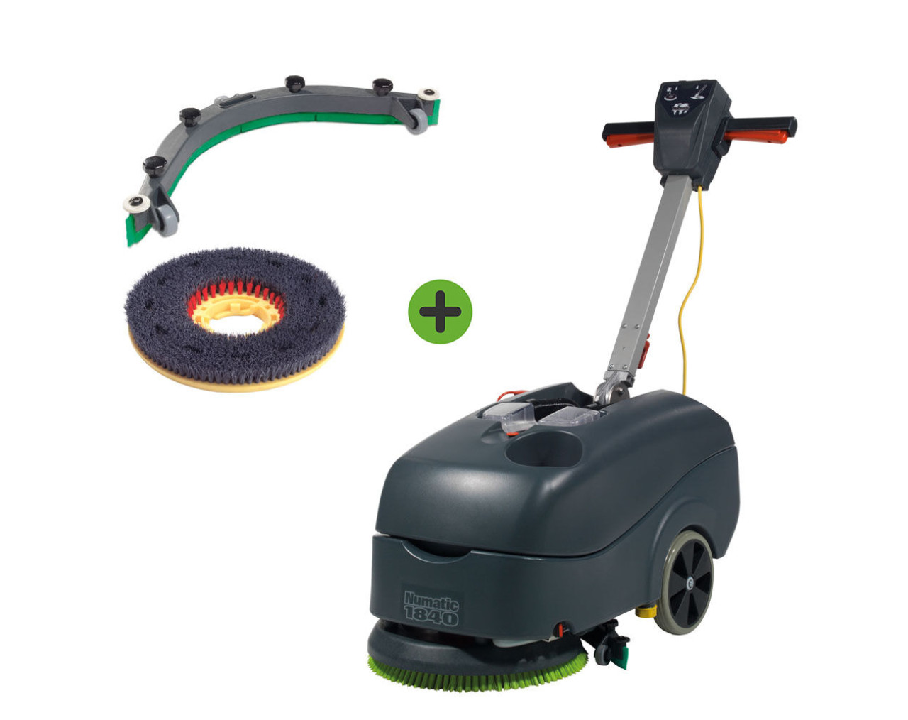 Numatic Kabel-Scheuersaugmaschine TT1840G inkl. SC-Bürste, rot - kompakt & unkompliziert Die Numatic Kabel-Scheuersaugmaschine TT1840G ist die ideale Lösung für die gründliche Reinigung kleiner Flächen. Diese kompakte und wendige Maschine überzeugt durch ihre handliche Bauweise, die eine einfache Manövrierbarkeit ermöglicht. Die roten Bedienelemente sind speziell für eine unkomplizierte Handhabung und Pflege konzipiert, was den täglichen Einsatz erleichtert. Der Wechsel von Bürsten und Treibtellern gestaltet sich besonders einfach und schnell, wodurch die Maschine flexibel und effizient eingesetzt werden kann. Die Haltbarkeit der SC-Bürste entspricht dabei der von 100 Numatic Pads oder 10 Numatic Bürsten, was für eine hohe Langlebigkeit und geringe Betriebskosten sorgt. Vorteile Hervorragende Wendigkeit: Die kompakte und handliche Bauweise ermöglicht eine einfache Manövrierbarkeit, ideal für die Reinigung von engen und kleinen Flächen. Einfache Bedienung: Dank der roten Bedienelemente ist die Handhabung der Maschine intuitiv und benutzerfreundlich, was den Schulungsaufwand minimiert und die Effizienz erhöht. Langlebigkeit und Kosteneffizienz: Die langlebige SC-Bürste sorgt für eine hohe Reinigungsleistung und reduziert die Notwendigkeit häufiger Ersatzteile, was langfristig Kosten spart. Lieferumfang: Saugfuss komplett für TT(B)1840 SC-Scheuerbürste rot, 370/400 mm Optionales Zubehör Serilor Gummilippenset für TT(B)1840 PadLoc Treibteller, 356 mm Nylon-Scheuerbürste, 400 mm Zuleitung 3 x 1,0 mm², 20 m, gelb 356 mm Numatic PU Longlife PowerPad Technische Daten Gewicht:38,5 kgFrischwassertank:18 LNennspannung:230 V AC 50 HzKabel:20 mSaugmotor:300 WBürstendurchmesser:400 mmPaddurchmesser:356 mmBürstenumdrehungen:150 U/Min.Bürstmotor:400 WAbmessungen (L x B x H):520 x 850 x 1132 mmVE:1