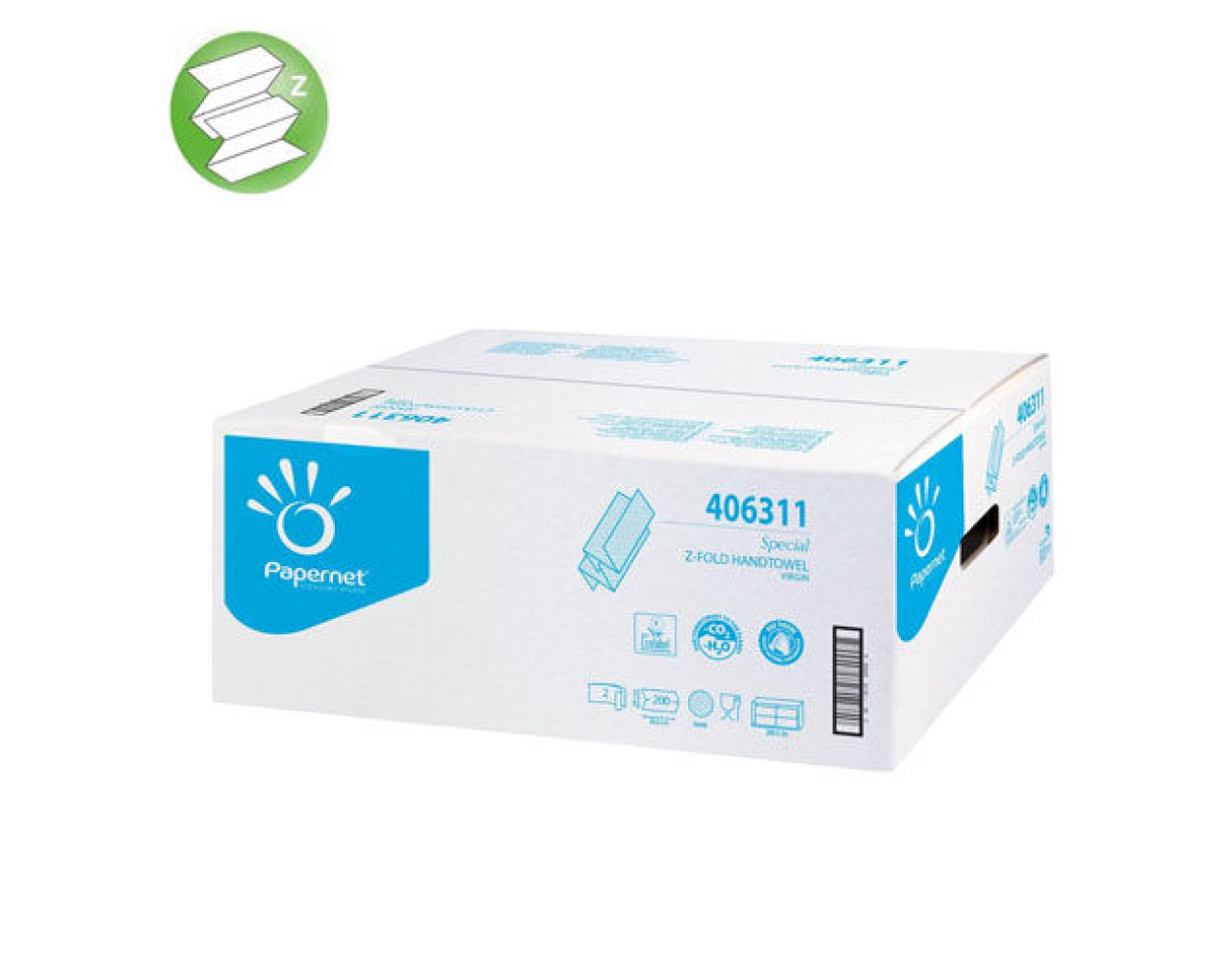 Handtücher Papernet Spezial Z-Falz, hochweiß, Zellstoff, 20,3 x 24 cmDie Papernet Falthandtücher sind mit dem EU Ecolabel zertifiziert und ist für Sie die nachhaltige Lösung für die Verwendung von Papierhandtüchern. Dank den 2 Lagen und dem Z-Falz können die Handpapertücher hygienisch einzeln entnommen werden. Eine optimale Trocknung der Hände ist garantiert. In einem Karton befinden sich insgesamt 4000 Tücher (20 x 200). VorteileEU Ecolabelhygienischer als Lufttrocknerumweltfreundlich und nachhaltigpraktische Verpackungseinheit ProdukteigenschaftenFalzart:Z-FalzRohstoff:ZellstoffLebensmittelunbedenklichkeit:jaLagen:2-lagigFlächengewicht g/m²:20Weißgrad:85Prägung:WaveBlattanzahl:200Abmessungen (L x H):20,30 x 24 cmZentral zugeführt:neinVE:4000 Blatt / KartonVE Palette:40 Kartons