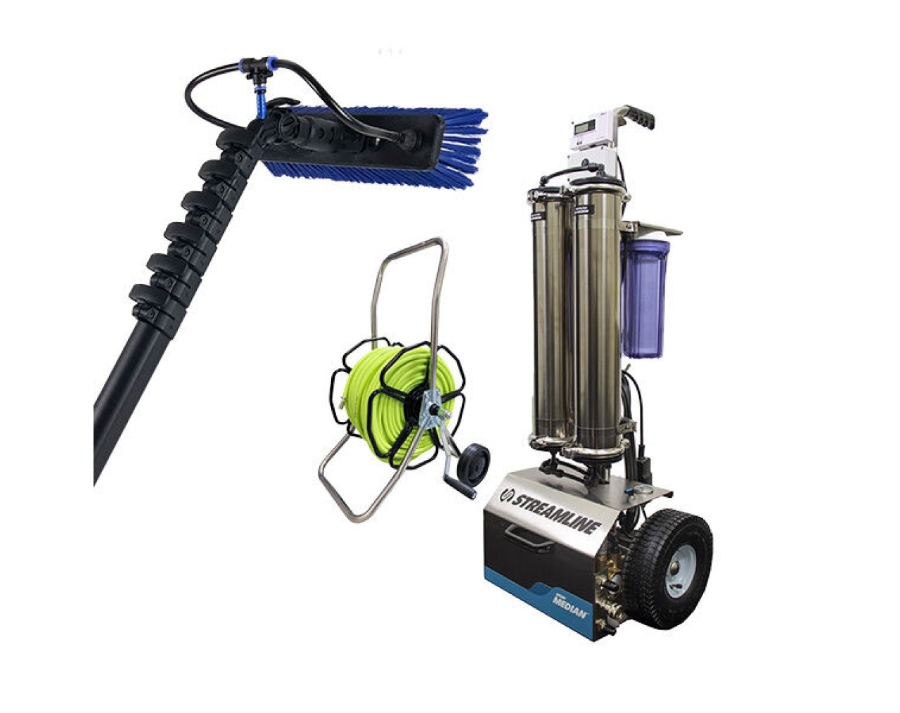 Streamline Mobi Median RO-System Komplettset inkl. Teleskopstange, Bürste, Schlauch & Schlauchwagen Das tragbare System Mobi Median ist die perfekte Lösung für eine effiziente Reinwasserreinigung in verschiedenen Anwendungsbereichen, wie z. B. Fenster, Glasfassaden, Solaranlagen. Das Spülventil des Systems ermöglicht eine einfache Membranspülung, die Verunreinigungen wie Sedimente und Bakterien entfernt, die Lebensdauer der Membran verlängert und Schlieren verhindert. Mit einer leistungsstarken Pumpe und größeren Filtern sorgt das System für eine robuste Filtration und spart Zeit und Geld durch weniger Filterwechsel. Die hohe Durchflussrate von 6 Litern pro Minute ist ideal für die Reinigung großer Flächen und die Beseitigung von hartnäckigem Schmutz an Fenstern. Vereinfachen Sie Ihre Arbeit mit dem Mobi Median System für eine effektive und mühelose Filtration. Zusammen mit der Streamline OVA8 Teleskopstange aus Karbon können Sie in Reinigungsarbeiten in bis zu 9 Metern Höhe ohne Leiter durchführen. Dieses Reinwasser Set beinhaltet: 1 x RO-Umkehrosmose-System + 18000GPD Double Membranen 1 x Edelstahl-Schlauchwagen inkl. 100 Meter Hi-Viz Schlauch 1 x Streamline OVA-8 Karbon Teleskopstange 9,15 Meter, inkl. Bürste, 260 mm, 1 x Adapter 6 mm, 1 x Anschluss-Kit mit 2 Strahldüsen Vorteile kompaktes mobiles Wasserreinigungssystem leicht zu verstauen und zu transportieren leistungsstarke Pumpe, die mehr Wasser durchdrückt größere Filter für6 Liter Reinwasser pro Minute netzbetrieben schnell abnehmbarer Stecker Einsatzbereiche für das Mobi Median RO System: Glasreinigung Einkaufszentren Reinigung von Sonnenkollektoren Schulen / Campusse / Universitäten Integriertes Spülventil: Ein Spülventil ermöglicht die Spülung der Membranen im System, das die Lebensdauer der RO-Membranen durch die Entfernung von Verunreinigungen wie Sediment, Binsen und Bakterien. Wir empfehlen, Ihre RO-Membran alle 2-3 Monate zu spülen. Höhere Pumpenleistung und größere Filter: Sparen Sie auf lange Sicht Zeit und Geld mit einer höheren Filterkapazität, die längere Filterzyklen und weniger Filterwechsel ermöglicht. Mit einer höheren Wasserdurchflussrate kann eine Hochleistungspumpe auch Wasser mit einer höheren Durchflussrate fördern, was bei der Reinigung größerer Flächen oder bei der Reinigung von Fenstern mit starker Verschmutzung von Vorteil sein kann. Hinweis: Nach Anmerkung des Lieferanten wird sich das Design in Kürze ändern, um die RO-Filter leichter zu entfernen und austauschen zu können. Daher können die aktuellen Bilder der Mobi Median eventuell optisch abweichen. Technische Daten für die Mobi Median Gewicht: 35 kg Betriebsdruck: 6,9 bar Durchflussmenge: 6 Liter pro Minute Filterung: 2 x 4021 RO-Membranen TDS Meter: Inline-TDS mit 2 Probenahmestellen Version: Stromnetz Maße (B x T x H): 50 x 38 x 120 cm Material: Edelstahl VE: 1 Produkteigenschaften Streamline OVA8 Teleskopstange Anzahl der Elemente: 6 Länge eingefahren: 1.865 mm maximale Länge: 9.150 mm erreichbare Höhe: ca. 10 m Stangengewicht: 1,70 kg Schlauchlänge: 12 m Produkteigenschaften Schlauchwagen inkl. Schlauch Schlauchlänge: 100 m Kupplung: 8 mm Abmessungen Schlauchwagen (B x T x H): 50 x 45 x 70 cm