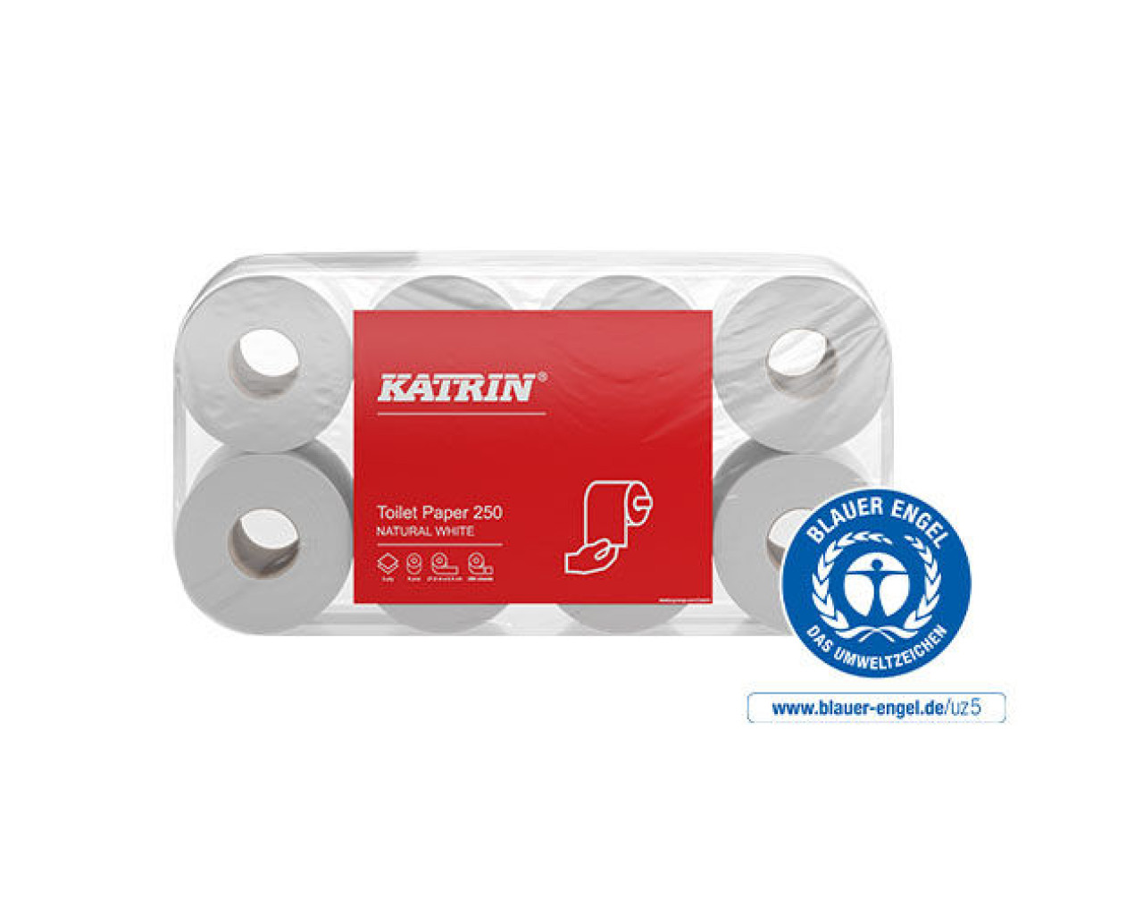 Katrin Basic Toilettenpapier, 2-lagig, 250 Blatt, 64 Rollen à Pack Komfort und Nachhaltigkeit für den täglichen Bedarf Das Katrin Toilettenpapier 250 Blatt, 2-lagig, bietet eine ausgezeichnete Lösung für den täglichen Gebrauch. Diese konventionellen Toilettenpapierrollen sind speziell entwickelt, um maximalen Komfort und Effizienz zu gewährleisten. Mit 250 Blättern pro Rolle und einer weichen, weißen 2-lagigen Struktur ist dieses Toilettenpapier ideal für eine angenehme Nutzung. Das Papier zeichnet sich durch seine hohe Saugfähigkeit aus und wird aus hochwertigen Fasern hergestellt, die sich unter normalen Nutzungsbedingungen in nur 90 Sekunden schnell und effizient im Wasser auflösen. Dies trägt nicht nur zur Vermeidung von Verstopfungen bei, sondern unterstützt auch die Hygiene und Sauberkeit. Zusätzlich ist das Katrin Toilettenpapier mit dem EU Ecolabel zertifiziert, was seine umweltfreundlichen Eigenschaften unterstreicht. Eine Packung enthält acht Rollen, die in einem sauberen Weiß gehalten sind und somit in jede Umgebung passen. Katrin Toilettenpapier verbindet Qualität, Komfort und Nachhaltigkeit, um den Anforderungen des modernen Alltags gerecht zu werden. Vorteile Hohe Saugfähigkeit und Komfort: Das 2-lagige, weiße Papier bietet eine ausgezeichnete Saugfähigkeit und sorgt für maximalen Komfort bei der Nutzung. Schnell auflösend und umweltfreundlich: Hergestellt aus hochwertigen Fasern, löst sich das Papier unter normalen Nutzungsbedingungen in nur 90 Sekunden schnell und effizient im Wasser auf. Das Produkt ist zudem mit dem EU Ecolabel zertifiziert, was seine umweltfreundlichen Eigenschaften unterstreicht. Das Katrin Toilettenpapier 250 Blatt, 2-lagig, ist kompatibel mit folgenden Toilettenpapierspendern: Katrin Toilettenpapierspender für 2 Rollen, weiß (92384) Katrin Toilettenpapierspender für 2 Rollen, schwarz (104452) Katrin Toilettenpapierspender für 3 Rollen, weißes Metall (984503) Katrin Toilettenpapierspender für 2 Rollen, Edelstahl (989706) Produkteigenschaften Lagen:2-lagigFarbe:weißBlattlänge:110 mmAnzahl Blätter pro Rolle:250Rollenlänge:27,5 mRollendurchmesser:105 mmGewicht pro Pack:0,691 kgVE64 RollenPalette:30 VE