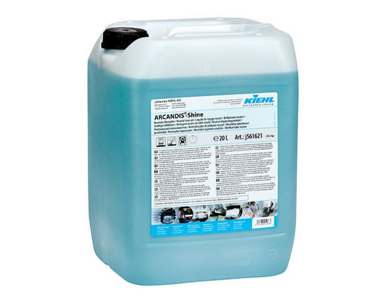 Kiehl ARCANDIS-Shine Neutraler Klarspüler optimal für Geschirrspülmaschinen Vorteile hochkonzentrierter, neutraler Klarspüler für gewerbliche Geschirrspülmaschinen schnelle, streifen- und fleckenfreie Trocknung des Spülgutes schaumarm eingestellt, deswegen selbst bei höherer Konzentration verringertes Aufschäumen sorgt für einwandfrei glänzendes Geschirr Der ARCANDIS-Shine Neutraler Klarspüler ist in folgenden Ausführungen erhältlich: 10 Liter Kanister 20 Liter Kanister Anwendungsbereich Für alle Arten von alkalibeständigem Spülgut aus Porzellan, Glas, Edelstahl und Kunststoff. Anwendung Vor der Erstanwendung ist die Materialverträglichkeit an unauffälliger Stelle zu überprüfen. Maschinelle Geschirr-Reinigung: Die Dosierwerte liegen zwischen 0,2‒0,5 g/L Wasser. Die Dosierung erfolgt über eine maschinenintegrierte Dosiervorrichtung oder über programmierbare KIEHL-Dosiergeräte. Um das bestmögliche Trocknungsergebnis zu erzielen, wird die Dosierung entsprechend den objektspezifischen Bedingungen (Wasserhärte, Verschmutzungsgrad, Maschinentyp) von einem KIEHL-Servicetechniker eingestellt. Verbrauch: keine Angabe möglich. Der Verbrauch ist abhängig von den objektspezifischen Bedingungen und Vorgaben. Ein optimales Reinigungsergebnis wird in Kombination mit ARCANDIS-Eco oder ARCANDIS-Classic sichergestellt. Hinweise: Für die nicht sachgemäße oder nicht fachgerechte Anwendung und daraus entstehende Schäden kann keine Haftung übernommen werden. Kein Verbraucherprodukt nach 1999/44/EG Art. 1! Produktzusammensetzung (nach 648/2004/EG) Nichtionische Tenside 5–15 %, Lösungsvermittler, Lebensmittelfarbstoff, Konservierungsmittel (Benz-, Methylisothiazolinone). pH-Wert (Konzentrat): ca. 7 pH-Wert (Gebrauchslösung): ca. 7 Produkteigenschaften Gebindegrößen: 10 Liter Kanister / 20 Liter Kanister Aggregatzustand: flüssig Geruch: charakteristisch Farbe: blau pH-Wert (bei 20 °C): ca. 7,0 VE: 1 Kanister VE 10 L Kanister Palette: 60 Kanister VE 20 L Kanister Palette: 36 Kanister Pflichthinweise Das Gemisch ist nicht als gefährlich eingestuft im Sinne der Verordnung (EG) Nr. 1272/2008 [CLP].