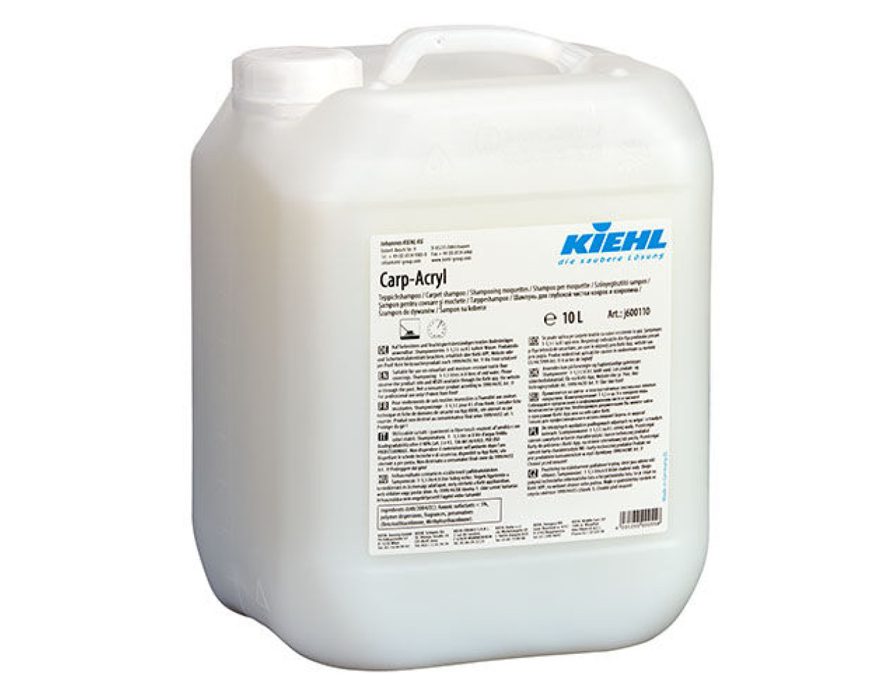 Kiehl Carp-Acryl Teppichshampoo, faserschonend, 10 Liter Kanister Vorteile reinigungsaktiver, faserschonender Schaum Bildung von absaugbaren Agglomeraten aus Polymer und Schmutz Agglomerate verkleben nicht mit der Teppichfaser (Anti-Soil-Effekt) bei übermäßiger Schaumbildung Schaum mit einem Wassersauger oder mit einem Sprühextraktionsgerät abgesaugen Anwendungsbereich Auf farbechten und feuchtigkeitsbeständigen textilen Bodenbelägen anwendbar. Anwendung Vor der Erstanwendung ist die Materialverträglichkeit an unauffälliger Stelle zu überprüfen. Teppichboden zunächst gründlich saugen. Shampoonieren: Je nach Verschmutzung 1-1,5 L zu 10 L Wasser. Shampoonierlösung in den Laugentank der Einscheibenmaschine füllen. Maschine auf genoppter Gummi- oder PVC-Platte anlaufen lassen bis Schaum entsteht. Danach den Teppich in kreisenden Bewegungen shampoonieren. Teppichflor aufrichten und bis zur völligen Abtrocknung nicht mehr betreten. Verbrauch: 50,0 ml/m². Hinweise: Für die nicht sachgemäße oder nicht fachgerechte Anwendung und daraus entstehende Schäden kann keine Haftung übernommen werden. Kein Verbraucherprodukt nach 1999/44/EG Art. 1! Richtige Dosierung spart Kosten und schont die Umwelt. Verpackungsmaterial ist recyclebar. Produktzusammensetzung (nach 648/2004/EG) Anionische Tenside < 5 %, Polymerdispersionen, Duftstoffe, Konservierungsmittel (Sodium Pyrithione, Benzisothiazolinone). pH-Wert (Konzentrat): ca. 8 pH-Wert (Gebrauchslösung): ca. 8 Produkteigenschaften Gebindegröße: 10 Liter Kanister Aggregatzustand: flüssig Geruch: angenehm Farbe: milchig pH-Wert (bei 20 °C): ca. 8,0 VE Flasche: 1 Kanister VE Palette: 60 Kanister Pflichthinweise Das Gemisch ist nicht als gefährlich eingestuft im Sinne der Verordnung (EG) Nr. 1272/2008 [CLP].