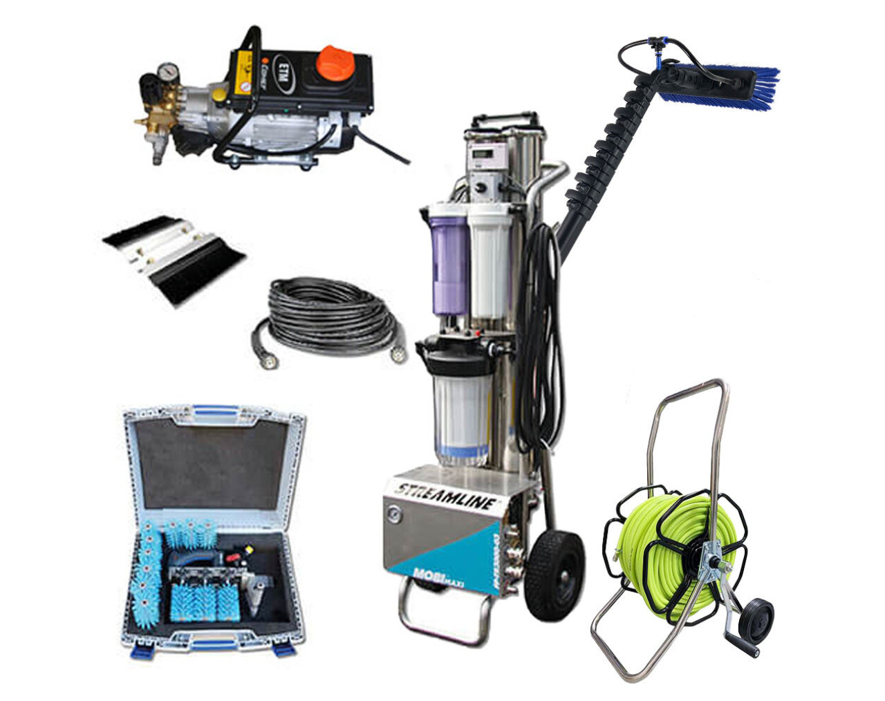 Lamellenreinigung Profi-Set 1.0 Bieten Sie Ihren Kunden eine professionelle Reinigung von Außenjalousien oder Fensterläden mit dem Cleantecs Lamellenreiniger und dem MOBI Maxi Double RO-System! Zu einer strahlenden Fassade und glänzenden Fenstern gehören auch saubere Jalousien. Nicht nur für das gute Aussehen, sondern auch für den Wert- und Funktionserhalt sollten Außenjalousien regelmäßig von natürlichen und atmosphärischen Verschmutzungen befreit werden. Eine schnelle und umweltschonende Reinigung garantiert die Kombination von dem Cleantecs Lamellenreiniger und der Reinigung mit Reinwasser. Die Reinwasserherstellung übernimmt dabei der MOBI Maxi Double bedarfsgerecht und vor Ort. Dank seiner zwei Membranen kann er mehr als 11 Liter Reinwasser in der Minute produzieren. Schließen Sie den MOBI Maxi Double direkt an den Hochdruckreiniger an und sparen Sie so den umständlichen Puffertank! Der Hochdruckreiniger treibt mit dem Reinwasser die rotierenden Bürsten des Cleantecs Lamellenreinigers an. So reinigen Sie schnell und effektiv und das Beste: Das Reinwasser benötigt keine Zugabe von Reinigungschemie und trocknet rückstandslos ab! Perfekte Ergebnisse in nur einem Arbeitsgang! Der Cleantecs Lamellenreiniger ist mit knapp 2 Kilogramm sehr leicht und daher auch bei längeren Einsätzen gut zu führen. Der Bürstenabstand kann individuell eingestellt werden und genauso mühelos gelingt der Bürstentausch, dank Schnellwechselsystem. Das Set beinhaltet außerdem einen Hochdruckreiniger, einen passenden Hochdruck-Flexi-Schlauch, den Cleantecs Transportkoffer für den Lamellenreiniger und den Spritzschutz. Damit Sie bei den Reinigungsarbeiten trocken bleiben! Dieses Set beinhaltet: JLR-180-GTR – Lamellenreiniger JFPTR2000-03 – Mobi Maxi Double Umkehrosmose-System JHP-ETM150X – Hochdruckreiniger JNW6-25 – Hochdruck Flexi-Schlauch, 25 m JLRTK1 – Transportkoffer JLR-SS – Spritzschutz JOV30-24-E – OVA8 Karbon Teleskopstange 9,15 m mit 26 cm Bürste, 6 mm Adapter, Schlauch Schlauchwagen mit 100 m Hi-Viz Schlauch Technische Daten LamellenreinigerBetriebsdruck:100-120 barFlächenleistung:60 m²/hTemperatur:max. 60 °C Bürsten-Ø: 80 mmWasserverbrauch:ca. 10 L/Min.Tiefe:12 cmBaugröße:300 x 320 x 260 mmGewicht:ca. 1,9 kgAnschluss: M22 x 1,5 AG VE:1 Technische Daten Hochdruckreiniger Motor:3,0 HP / 2,2 kWTrockengewicht:25 kgAbmessungen (L x B x H):26 x 47 x 37 cmSpannung:240 VDruck:150 barLeistung:2900 WStromversorgung:kabelgebundenLänge der Leitung:10 mMaterial:Kunststoff, Metall, MessingDurchfluss:10 L/Min.VE:1Produkteigenschaften Flexi-SchlauchLänge:25 mMax. Druck:260 barMax. Temperatur:150 °C Nennweite: NW6Anschluss/ Ausgang:M22 x 1,5 IGProdukteigenschaften TransportkofferGewicht:2 kgAbmessungen (L x B x H):57 x 55 x 27 cmVE:1Produkteigenschaften Spritzschutz für LamellenreinigerGewicht:0,2 kgVE:1Produkteigenschaften OVA8 TeleskopstangeAnzahl der Elemente:6Länge eingefahren:1.865 mmMax. Länge:9,15 mErreichbare Höhe:ca. 10 mStangengewicht:1,70 kgSchlauchlänge:12 mMaterial:KarbonfaserVE:1Produkteigenschaften SchlauchwagenSchlauchlänge:100 mKupplung:8 mmAbmessungen (B x T x H):50 x 45 x 70 cmVE:1 Technische Daten MOBI MAXIFiltrationsarten: 5 Mikron Sediment Filter, Umkehrosmose-Membran, DI-Filter Max. Druck:120 psiMax. Durchflussgeschwindigkeit: 6,3 Liter / Minute* geeigneter TDS-Wert Eingangswasser: 100-600 ppmm endgültiger TDS-Wert Ausgangswasser: 0 ppmSpannung:230 VGewicht:ca. 43 kgGleichzeitige Anwender:2 Personen *unter optimalen Bedingungen