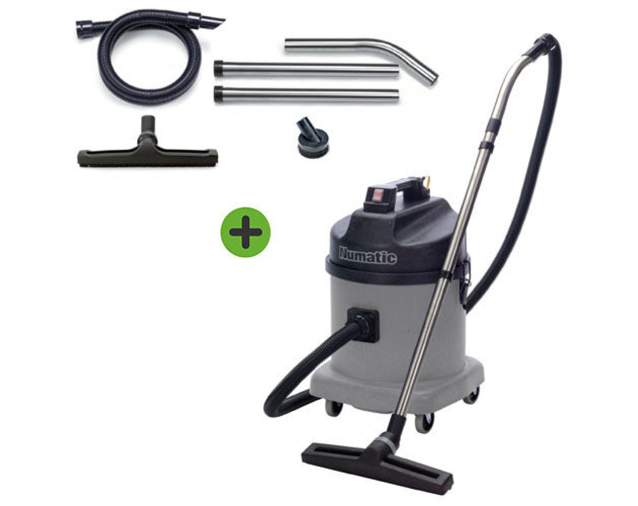 Numatic NED570 - leistungsstarker Industriestaubsauger inkl. 38 mm Zubehör-Set BB5 Der zweimotorige Numatic NED70 Feinstaubsauger wird mit einem umfangreichen Zubehörset geliefert, jede professionelle Reinigungsarbeiten zu bewältigen. Er arbeitet mit einen hocheffizienten MicroFlo-Vliesfilter, der speziell für die Aufnahme von Feinstäuben wie Quarz- oder Zementstäuben konzipiert wurde. Den Filter müssen Sie separat bestellen unter MicroFlo Feinstaubfilter NVM-3BM. Der Industriesauger NED570 unterstützt Sie bei den Reinigungsarbeiten mit einem simplen Kabelschnellwechselsystem und der integrierten Leuchtdiode. Perfekt geeignet für den professionellen Einsatz in der Industrie- und Renovierungsbranche sowie allen anderen Umgebungen, bei denen der Feinstaubsauger zur Anwendung kommt. Vorteile zwei geräuscharme und langlebige Bypass-Motoren hocheffizienter MicroFlo-Vliesfilter für Feinstäube wie z.B. Quarz- und Zementstäube (nicht im Lieferumfang) einfaches Kabelschnellwechselsystem Leuchtdiode zeigt volles oder verstopftes Filtersystem an patentiertes AirFlo-Behälterdesign für optimale Staubaufnahme Kessel und Kopf sind aus bruchfestem Structofoam gefertigt Inklusive Zubehör Nuflex Saugschlauch 2,4 m komplett mit Anschlüssen Saugrohrbogen aus Edelstahl Handrohr Mittelstück aus Edelstahl 440 mm Rundbürste 105 mm mit harten Borsten Trockensaugdüse 400 mm mit Bürste/Bürste und Laufrollen Als weiteres Zubehör erhältlich MicroFlo Feinstaubfilter NVM-3BM (1 VE = 5 Stück) Microtex-Kombi-Filter 356 mm Nucable Zuleitung 3-adrig, 10 m x 1,50 mm, NuCable, gelb Zubehör für den Numatic NED570 bestellen wir für Sie selbstverständlich! Rufen Sie direkt an oder schreiben Sie uns eine Nachricht! Technische Daten Saugmotor: 2 x 620 W Nennspannung: 230 V AC 50 Hz Unterdruck: 2300 mmWS Luftfördermenge: 96 L/Sek. Behälterinhalt trocken: 23 Liter Kabel: 10 m Gewicht: 16,5 kg Staubschutzklasse: L Abmessungen (L x B x H): 415 x 415 x 645 mm VE: 1