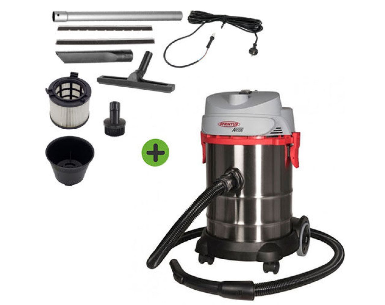 Sprintus ARTOS Nass-/Trockensauger 30 Liter Hochwertiger und leistungsstarker 30 Liter Nass- / Trockensauger zu einem fairen Preis-Leistungs-Verhältnis Aufgrund seiner Leistungsstärke, kompakten Abmessungen und robusten Bauweise ist der Sauger ideal für die Gebäudereinigung, Industrie und Werkstätten geeignet. Das neueste SPRiNTUS Highlight, der in der 30-Liter-Klasse angesiedelte Nass- /Trockensauger Artos, beindruckt durch seine hohe Qualität und ein sensationelles Preis-Leistungs- Verhältnis. Innovative Features, wie das Zyklon-Wasserabscheidesystem mit zuverlässiger Schwimmerabschaltung, heben den Artos deutlich von anderen Modellen der Nass-/ Trockensauger - Einstiegsklasse ab. Das breite Fahrwerk und der lange Radstand machen den Artos zu einem besonders agilen Partner, welcher sich ganz leicht über die zu reinigende Fläche manövrieren lässt. Äußerst anwenderfreundlich ist die in der Grundausstattung enthaltene 360 mm breite Bodendüse, die durch einfaches Austauschen der Gummilippen bzw. Bürststreifen von einer Nassbodendüse zu einer Trockenbodendüse umfunktioniert werden kann. Qualitativ hochwertige Komponenten, wie das stabile Edelstahlgehäuse und der 1200 Watt Motor, machen den Artos zu einem robusten und zuverlässigen Begleiter in der professionellen Reinigung. Zubehör, im Lieferumfang inbegriffen Aluminium-Saugrohr einzeln, 0,5 m Saugschlauch komplett, 2,5 m Nassbodendüse 360 mm mit Parkhaken Bürststreifen-Set 360 mm Fugendüse 230 mm Rundpinsel Zykloneinsatz HEPA 13 Feinstaub-Filterpatrone Netzkabel 7,5 m, schwarz Optionales Zubehör Vliesfiltertüte (5 Stück) Teleskoprohr Edelstahl Ersatzgummilippe für 101.106 Saugschlauch, 3 m, antistatisch Handgriff, antistatisch mit Anschlussmuffe Wir bestellen gerne weiteres Zubehör für den Sprintus ARTOS! Schreiben Sie uns eine Nachricht oder kontaktieren Sie uns direkt telefonisch! Technische Daten Netzspannung: 220-240 V / 50 Hz Leistung: 1200 W Schalldruckpegel: 76 dB(A) Volumenstrom: 48 Liter / Sek. Max. Unterdruck: 230 mbar Behältermaterial: Edelstahl Behältervolumen: 30 Liter (brutto) Länge Netzkabel: 7,5 m Saugschlauchlänge: 2,5 m Saugschlauch-ø: 32 mm Saugrohr-ø: 32 mm Gerätegewicht: 8,9 kg Abmessungen (L x B x H): 42 x 38 x 63 cm Weitere Informationen über den Sprintus ARTOS Nass-/Trockensauger