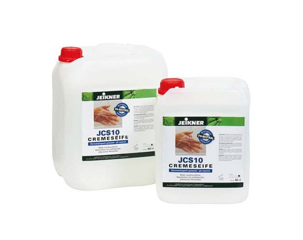 Weiße Cremeseife im Kanister, zum Nachfüllen von Seifenspendern Hautmilde, angenehm duftende weiße Seifencreme zur Reinigung und Körperpflege mit rückfettenden Rohstoffen. Geeignet für die häufige Anwendung bei leicht verschmutzten Händen in Großküchen und in der lebensmittelverarbeitenden Industrie. Vorteile pH-neutral und dermatologisch getestet rückfettend für Spendersysteme geeignet Die JCS10 Cremeseife weiß ist in folgenden Gebindegrößen erhältlich: 1 Liter Flasche 5 Liter Kanister 10 Liter Kanister Hinweis: Die 1 Liter Flasche ist mit einem 45° Winkel Sprühkopf ausgestattet. Produkteigenschaften Gebindegrößen: 1 Liter Flasche / 5 Liter Kanister / 10 Liter Kanister Geruch: frisch Farbe: weiß pH-Wert: 4,6-5,0 VE Flasche: 12 VE 5 L Kanister: 4 VE 10 L Kanister: 2 Pflichthinweise Kosmetika Keine gefährlichen Inhaltsstoffe. Das Produkt ist nach EG-Richtlinien oder den jeweiligen nationalen Gesetzen nicht kennzeichnungspflichtig.