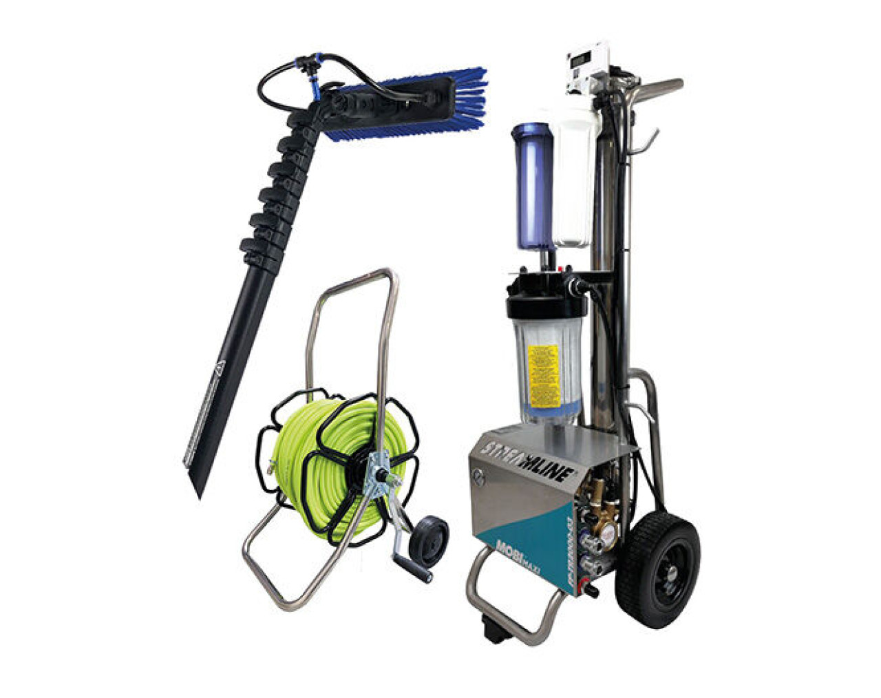 Aktionsset Osmosereinigung! Streamline MOBI MAXI inkl. Teleskopstange, Bürste, Schlauch & Schlauchwagen Der Streamline MOBI MAXI inklusive robustem Transportgestell liefert genügend Druck und Wasser, um mit zwei Nutzern gleichzeitig in bis zu 22 m Höhe zu reinigen. Als Zubehör erhalten Sie in diesem Set eine wasserführende Stange mit 9,15 Metern Länge: Die Streamline OVA-8 Teleskopstange aus Karbon hat einen einzigartigen ovalen Querschnitt, der eine ergonomische und effiziente Reinigung mit der Teleskopstange ermöglicht. Alle OVA8 Stangen erhalten Sie bei uns inklusive Bürste und innenliegendem Schlauch. Damit Sie mit der Glasreinigung sofort loslegen können, haben wir dem Set einen Profi-Schlauchwagen aus Edelstahl inklusive 100 Meter-Schlauch zur Verwendung mit Reinstwasser beigefügt. Die Filterleistung des MOBI Maxis ist stark genug für die Filterung von sehr hartem Leitungswasser bis ca. 600 ppm. Erledigen Sie die Glasreinigung bei Ihren Kunden ab sofort professionell und effizient mit Reinstwasser! Alles, was Sie für den Start benötigen, haben wir für Sie in diesem MOBI MAXI Set zusammengestellt. Dieses Reinwasser-Set beinhaltet: 1 x MOBI MAXI RO-/DI-System 1 x Edelstahl-Schlauchwagen inkl.100 Meter Hi-Viz Schlauch 1 x Streamline OVA-8 Karbon Teleskopstange 9,15 Meter, inkl. Bürste Vorteile kompakter, robuster und stabiler Rahmen geeignet für 1 oder 2 Nutzer, mit separaten Anschlüssen kann in horizontaler oder vertikaler Position betrieben werden großes Membrangehäuse aus Edelstahl mit Membran FILTERPLUS 4040 Manometer zur Überwachung des Drucks im Membrangehäuse luftgekühlte Industrie-Druckerhöhungspumpe, 8,2 bar, 230 V inkl. Inline-TDS-Messgerät zur Überprüfung der Wasserqualität nach der RO-Filterung und nach der DI-Polierfilterung 5 m Stromkabel Edelstahl-Schlauchwagen inkl. 100 Meter Hi-Viz Schlauch Streamline OVA8 Karbon Teleskopstange 9,15 m inkl. Bürste und innenliegendem Schlauch Lieferung komplett mit Schlauchanschlüssen für Einlass, Auslass und Abwasseranschlüsse Technische Daten Streamline MOBI MAXI Reinwasser-System Filtrationsarten: 5 Mikron Sediment-Filter, Karbon-Filter, Umkehrosmose-Membran, DI-Filter max. Druck: 120 psi / 8,27 bar max. Durchflussgeschwindigkeit: 6,3 Liter / Minute* geeigneter TDS-Wert/Eingangswasser: 100–600 ppm endgültiger TDS-Wert/Ausgangswasser: 0 ppm Spannung: 230 V Gewicht ca. 43 kg max. Anzahl gleichzeitige Anwender: 2 Personen *unter optimalen Bedingungen