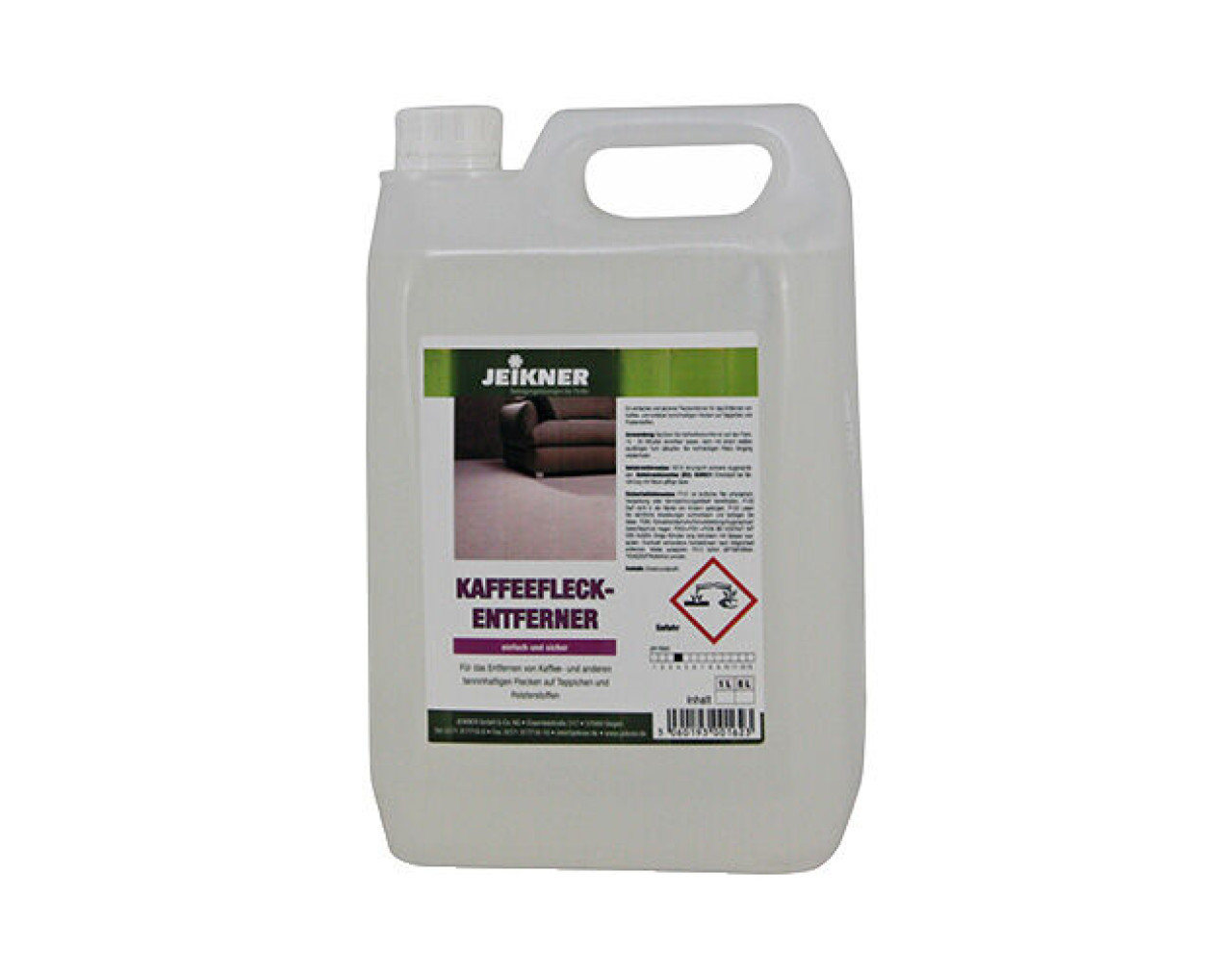 Kaffeeflecken entfernen – Profi-Fleckenentferner für Teppiche und Polster Der Jeikner Kaffefleck-Entferner für eine einfache und sichere Entfernung von Kaffee und anderen tanninhaltigen Flecken auf Teppichen und Polsterstoffen. Vorteile einfache Anwendung entfernt zuverlässig Kaffeeflecken aus Polstern und Teppichen Wie entferne ich Kaffeeflecken aus Teppichen und Polstern? Sprühen Sie Kaffeflecken-Entferner auf den Fleck und lassen Sie das Mittel 15 - 30 Minuten einwirken. Tupfen Sie den Teppich oder den Stoff mit einem weißen saugfähigen Tuch ab. Bei hartnäckigen Flecken den Vorgang wiederholen. Der Kaffefleck-Entferner ist in folgenden Ausführungen erhältlich: 1 Liter Flasche 5 Liter Kanister Lagerhinweise: Frostfei lagern. Bei sachgemäßer Lagerung mindestens 3 Jahre verwendbar. Ökologie: Das Produkt und die eingesetzten Waschrohstoffe (Tenside) erfüllen die Anforderungen des Gesetzgebers und Bezug auf die biologische Abbaubarkeit. Hinweis: Die 1 Liter Flasche ist mit einem 45° Winkel Sprühkopf ausgestattet. Produkteigenschaften Gebindegrößen: 1 Liter Flasche / 5 Liter Kanister Geruch: stechend Farbe: farblos pH-Wert (bei 20 °C): 4 Aggregatzustand: flüssig VE: 12 (Flasche) / 4 (Kanister) Pflichthinweise H318 Verursacht schwere Augenschäden | EUH031 Entwickelt bei Berührung mit Säure giftige Gase. P101 Ist ärztlicher Rat erforderlich, Verpackung oder Kennzeichnungsetikett bereithalten | P102 Darf nicht in die Hände von Kindern gelangen | P103 Lesen Sie sämtliche Anweisungen aufmerksam und befolgen Sie diese | P280 Schutzhandschuhe/Schutzkleidung/Augenschutz/Gesichtsschutz tragen | P305+P351+P338 BEI KONTAKT MIT DEN AUGEN: Einige Minuten lang behutsam mit Wasser ausspülen. Eventuell vorhandene Kontaktlinsen nach Möglichkeit entfernen. Weiter ausspülen | P310 Sofort GIFTINFORMATIONSZENTRUM/Arzt anrufen
