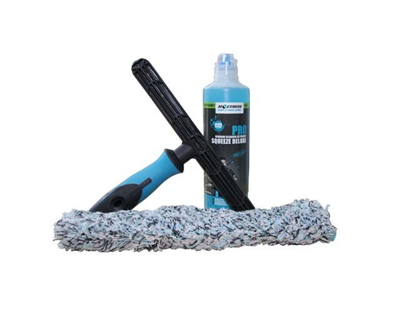 Moerman-Set mit Fugu Bezug, Premium T-Träger und Squeeze Deluxe-Flasche Moerman Set für stark verschmutzte Fenster, mit abrasiven Fugu-Bezug, passendem Premium Träger und Reinigungsmittel von Moerman. Set beinhaltet: Moerman Fugu Einwaschbezug Moerman Premium Trägerteil Moerman Squeeze Deluxe, 500 ml Erhältlich in den Größen 25 cm, 35 cm oder 45 cm. Moerman Fugu – Mikrofaser Einwaschbezug mit abbrassiven Borsten Vorteile mit abrasiven Borsten zum einfachen Entfernen von hartnäckigem Schmutz inklusive Schrubbpad hohes Wasserrückhaltevermögen verbesserte Klettverschlussqualität mit extra große Klettfläche für bessere Haftung hält auch starkem Schrubben stand durch extra starke Nähte an den Rändern Fasermix in schwarz, weiß, türkis Moerman Squeeze Deluxe – Profi-Glasreinigungsmittel für streifenfreie Glasreinigung Vorteile Fensterreinigungsmittel in der Squeeze-Flasche oder im praktischen Nachfüll-Kanister einfache Dosierung sehr ergiebiges Konzentrat: 3 Tropfen genügen erhältlich als 500 ml Flasche oder 5 Liter Kanister die 500 ml Flasche passt perfekt in die Moerman-Tasche Moerman Premium Trägerteil für Einwascher – ergonomisch und mit gutem Grip Vorteile sichererer Halt. auch bei Nässe ergonomisches und robustes Design mehrere Vertiefungen am Träger sorgen für erhöhten Wasserrückhalt einfaches Aufstecken am Verschlusskegel der Teleskopstange