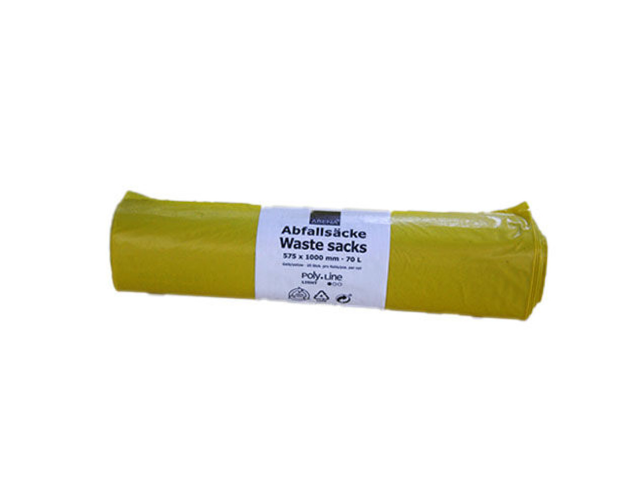ABENA Müllsack 70 Liter, gelb, 25 Stück pro Rolle Produkteigenschaften Inhalt: 70 Liter Farbe: gelb Material: LDPE Maße: 57, 5 x 100 cm Stärke: 32my VE: 25 Stück pro Rolle VE Karton: 10 Rollen