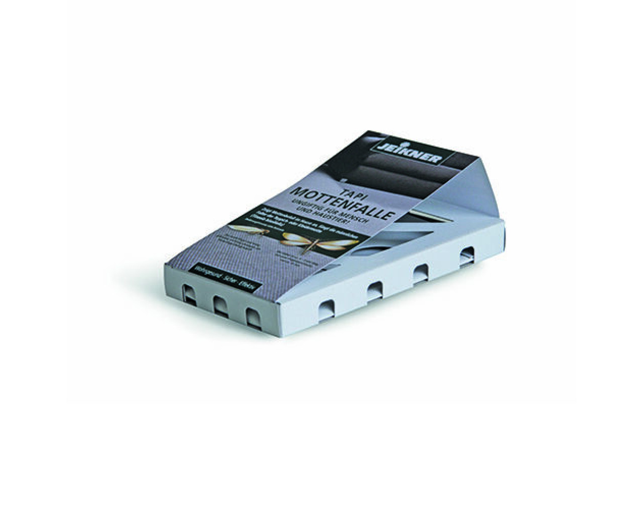 TAPI Mottenfalle zur Überwachung von Teppich- oder Kleidermottenbefall – ungiftig für Mensch und Haustier! Die Kleider- und Teppichmotte hinterlässt dauerhafte Fraßspuren auf Textilen. Oft werden die Motten erst durch die Schäden an Teppichen und Kleidung wahrgenommen, doch je früher der Befall erkannt wird, desto einfacher lassen sich zerfressene Teppiche und andere Textilien vermeiden. Den Mottenbefall und die Wirkung von Maßnahmen zur Mottenbekämpfung kontrollieren Die TAPI Mottenfalle lockt paarungswillige Männchen der Teppich- und Kleidermotte an, welche auf der Klebstofffläche der Falle haften bleiben. Die Falle wirkt etwa 60 – 90 Tage und kann anschließend einfach mit dem Restmüll entsorgt werden. Stellen Sie die Mottenfalle einfach dort auf, wo Sie Probleme mit Motten befürchten, zum Beispiel im Wohnraum oder im Kleiderschrank. Eine Falle deckt bis zu 60 m² Fläche ab. Die TAPI Mottenfalle ist eine Monitoringfalle, die keine ausreichend wirksame Bekämpfungsmaßnahme gegen Mottenbefall darstellt. Wird ein Befall mit Teppich- und Kleidermotten festgestellt, müssen geeignete Mittel zur Bekämpfung genutzt werden. Bitte beachten Sie dazu den Beipackzettel. Verpackungsinhalt 1 x Schachtel 1 x Verpackungstüte mit einem Klebebrettchen 1 x Abdeckungsdach als Staubschutz mit Platz zum Eintragen der Kontrolldaten 1 x Beipackzettel Produkteigenschaften VE: 5 Stk.