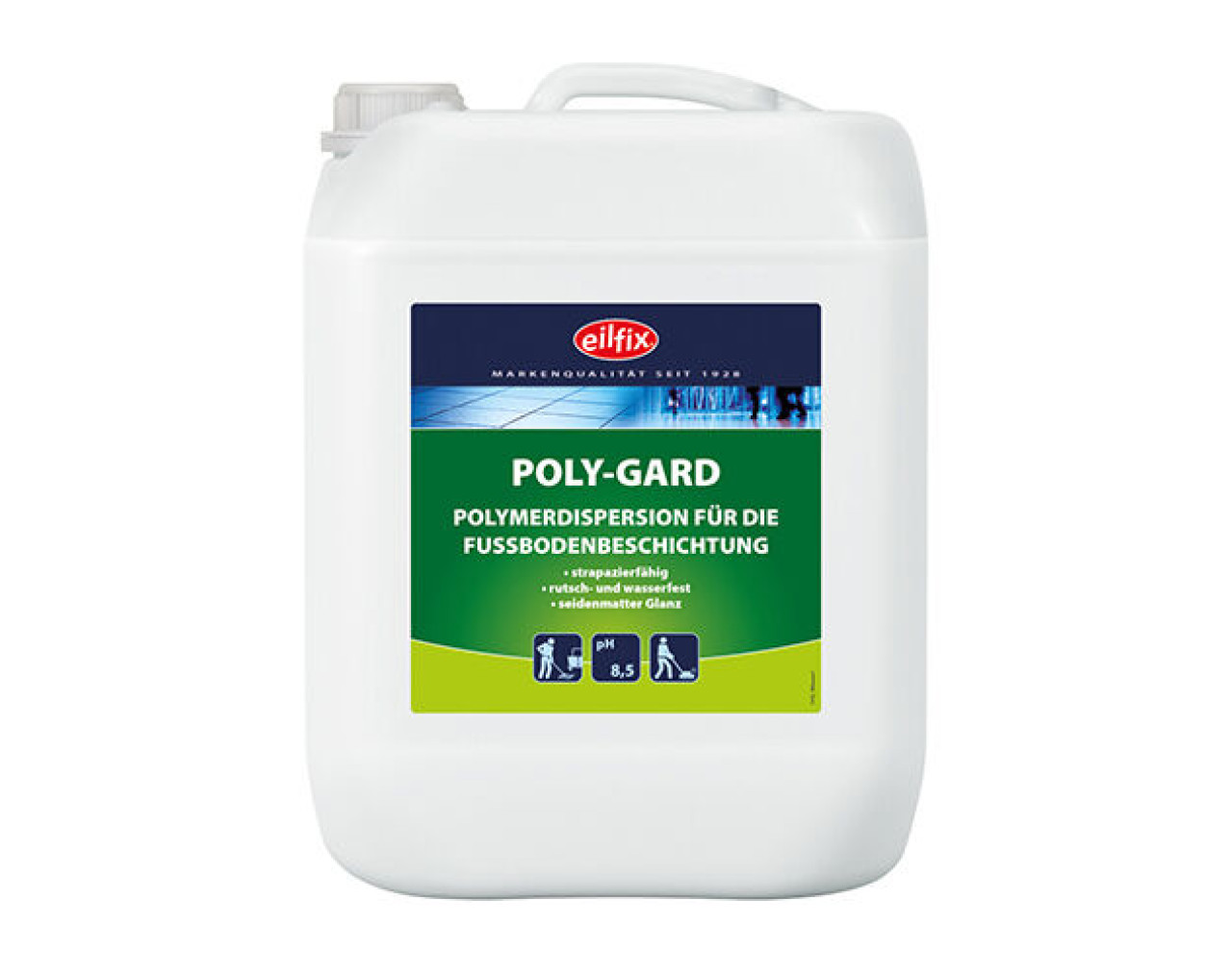 Strapazierfähige Fußbodenbeschichtung für alle wasserbeständigen Fußböden Poly-Gard ist nicht rutschend und hat eine sehr gute Haltbarkeit gegenüber Wasser und feuchtem Schmutz. Die Dispersion ergibt einen schmutzabweisenden, rutschhemmenden Film, der nicht vergilbt. Produkteigenschaften Gebindegröße: 10 Liter Kanister Geruch: wahrnehmbar Farbe: weiß pH-Wert: 8-9 VE Kanister: 1 VE Palette: 60 Pflichthinweise Das Gemisch ist nicht als gefährlich eingestuft im Sinne der Verordnung (EG) Nr. 1272/2008. EUH208 Enthält Gemisch aus: 5-Chlor-2-methyl-2H-isothiazol-3-on [EG-Nr. 247-500-7] und 2-Methyl-2H-isothiazol-3-on [EG-Nr. 220-239-6] (3:1). Kann allergische Reaktionen hervorrufen