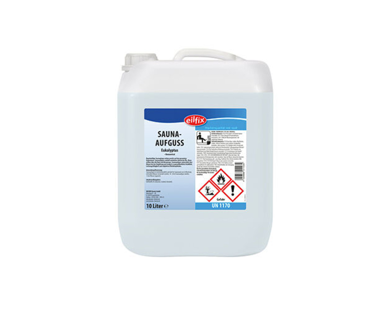 Saunaaufguss Eukalyptus – Konzentrat Regelmäßige Saunagänge wirken positiv auf den gesamten Organismus. Saunaaufguss enthält natürliche ätherische Öle. Diese wirken über die Haut und Atemwege. Saunaaufguss unterstützt den Körper bei der Entgiftung und steigert so gesundheitliche Stabilität, Leistungsfähigkeit und subjektives Wohlempfinden. Vorteile klassische und moderne Duftnoten wirtschaftliche Großgebinde Der Saunaaufguss Eukalyptus ist in folgenden Ausführungen erhältlich: 1 Liter Flasche 10 Liter Kanister Produkteigenschaften Gebindegrößen: 1 Liter Flasche / 10 Liter Kanister Geruch: parfümiert Farbe: klar pH-Wert: n.a. VE Flasche: 12 VE Flasche Palette: 480 VE Kanister: 1 VE Kanister Palette: 60 Pflichthinweise H225 Flüssigkeit und Dampf leicht entzündbar | H317 Kann allergische Hautreaktionen verursachen | H411 Giftig für Wasserorganismen, mit langfristiger Wirkung P210 Von Hitze, heißen Oberflächen, Funken, offenen Flammen sowie anderen Zündquellen fernhalten. Nicht rauchen | P233 Behälter dicht verschlossen halten | P241 Explosionsgeschützte elektrische/Lüftungs-/Beleuchtungsgeräte verwenden | P243 Maßnahmen gegen elektrostatische Entladungen treffen | P273 Freisetzung in die Umwelt vermeiden | P280 Schutzhandschuhe tragen | P403+P235 An einem gut belüfteten Ort aufbewahren. Kühl halten.