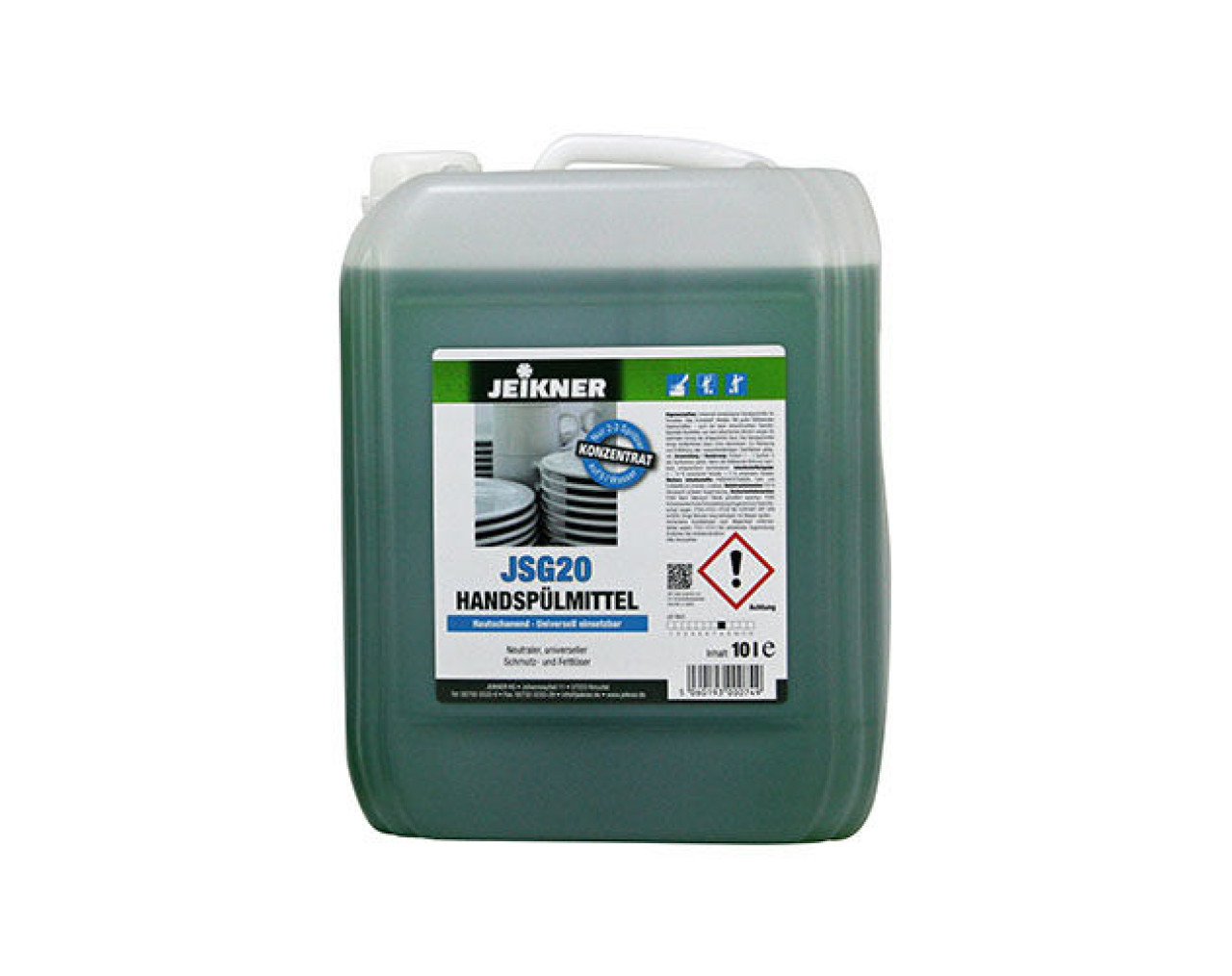 Handspülmittel JSG20, professionelles Geschirrspülmittel für Gastro Unser grünes Handspülmittel JSG20 ist ein neutraler, handschonender, universeller Schmutz- und Fettlöser für das Geschirrspülen in Gastronomie, Büros und Vereinsheimen. Dank seiner hohen Fettlösekraft und schaumstabilen Eigenschaften ist dieses flüssige Geschirrspülmittel auch beliebt bei Glasreinigern, als Wasserzusatz bei der Reinigung von Fenstern und Glasflächen. Vorteile Konzentrat mit frischem Zitronenduft ideal für die Glasreinigung schaumstabil Das JGS20 Handspülmittel ist in folgenden Varianten hier erhältlich: 1 Liter Flasche 10 Liter Flasche Anwendung/ Dosierung Einfach 2 – 3 Spritzer in das Spülbecken geben. Wenn die fettlösende Wirkung nachlässt, entsprechend nachdosieren. Lagerhinweise: Frostfrei lagern. Bei sachgemäßer Lagerung mindestens 2 Jahre verwendbar. Ökologie: Die in der Mischung verwendeten Tenside entsprechen der Detergenzienverordnung (Nr. 648/2004) und sind vollständig aerob abbaubar. Zusammensetzung: 5 – 15 % anionische Tenside, < 5 % amphotere Tenside. Weitere Inhaltsstoffe: PHENOXYETHANOL, Farb- und Duftstoffe (d-Limonen, Linalool). Produkteigenschaften Gebindegrößen: 1 Liter Flasche / 10 Liter Kanister Geruch: nach Zitrone Farbe: grün pH-Wert (bei 20 °C): 6,5 – 7 Aggegatzustand: flüssig VE Flasche: 12 VE Kanister: 2 Pflichthinweise H319 Verursacht schwere Augenreizung P305+P351+P338 BEI KONTAKT MIT DEN AUGEN: Einige Minuten lang behutsam mit Wasser ausspülen. Eventuell vorhandene Kontaktlinsen nach Möglichkeit entfernen. Weiter ausspülen | P337+P313 Bei anhaltender Augenreizung: Ärztlichen Rat einholen/ärztliche Hilfe hinzuziehen