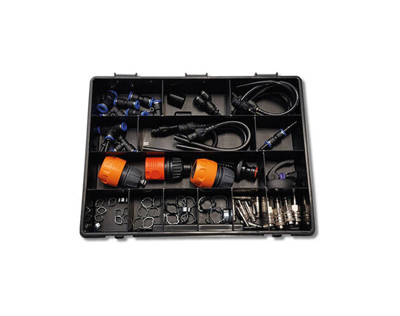 Das praktische Kleinteile-Set im Koffer Mit dem Streamline Kleinteile-Set sind Sie bestens ausgerüstet, um jederzeit Umkehrosmoseanlagen oder Teleskopstangen vor Ort zu reparieren. Alles ist griffbereit und erspart die Suche nach Ersatzteilen. Set bestehend aus: 2 x Stahl Düsen Anschluss-Kit 1 x 4er Düsen Anschluss-Kit 2 x OVA8 Stangen Klemme mit Hebel 2 x 12 mm Schnellkupplung 1 x 8 mm Schnellkupplung 6 x 0 Klemmschellen 7-9 mm 6 x 0 Klemmschellen 11-13 mm 6 x 0 Klemmschellen 11-15 mm 6 x 0 Klemmschellen 17-20 mm 4 x Stecknippel 6 mm 4 x Stecknippel 8 mm 2 x Kuppling mit Schlauchtülle 6 mm 2 x Kupplung mit Schlauchtülle 8 mm 1 x Adapter für Schlauch 6-8 mm 2 x Schlauchverbinder 6 mm 2 x gerade Steckverbinder 8 mm 2 x gerade Steckverbinder 10 mm 2 x Winkel Steckverbinder 10 mm 2 x Anschluss Kappen 1 x Plastik Koffer