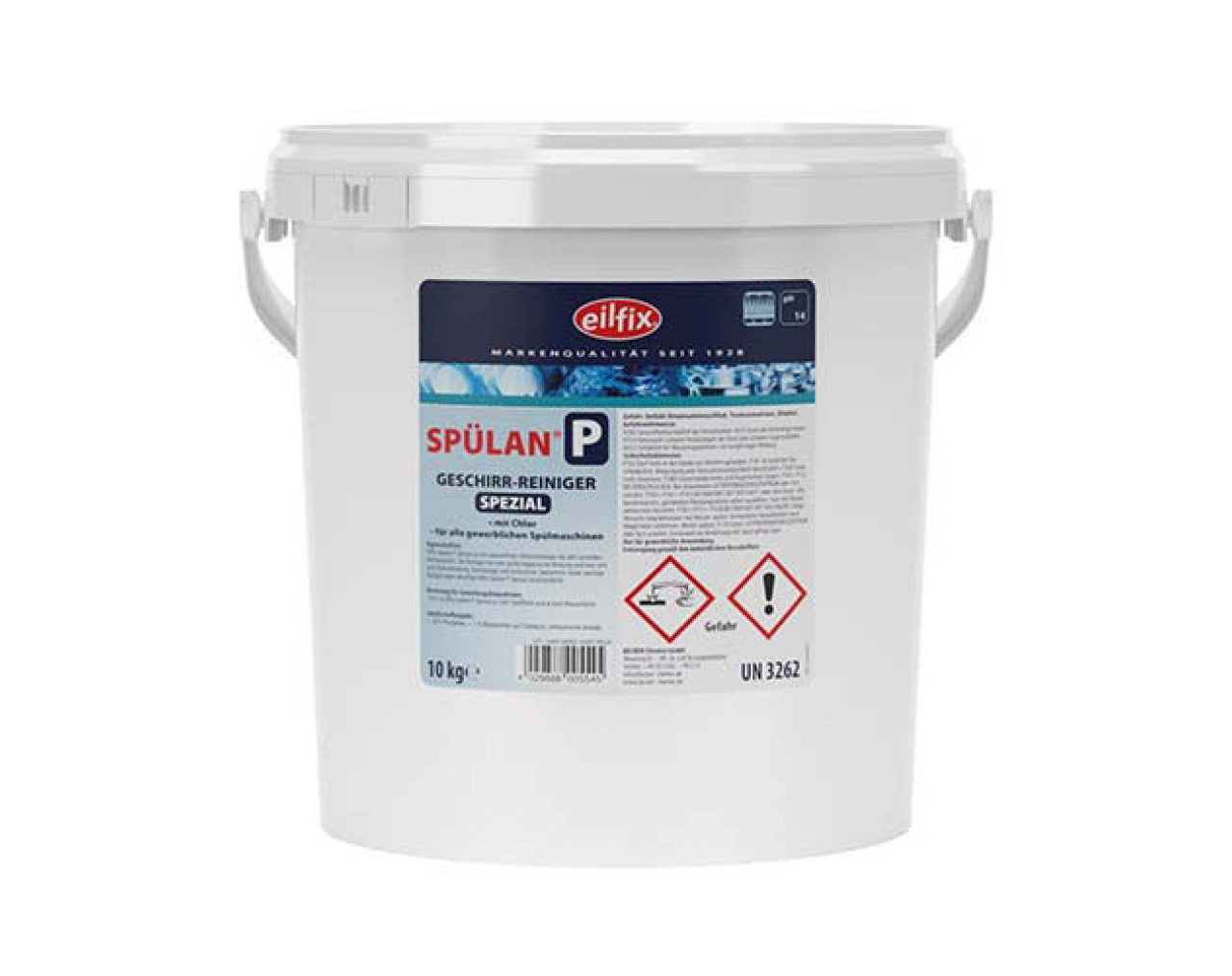 Eilfix Spülmaschinen-Reiniger für Gewerbespülmaschinen Kraftvoller Intensivreiniger in Pulverform für gewerbliche Spülmaschinen. Löst angetrocknete Speiserreste, Fette, Tee und Kaffeölreste von allen spülmaschinen-festen Materialien. Eilfix Spülan P ist ein Reiniger mit desinfizierender Wirkung und zeigt bei alle Wasserhärten beste Wirkung. Vorteile schaumfreier Intensivreiniger hohe Reinigungskraft für hygienische Gewerbespülmaschinen sehr gute Kalkabindung geeignet für alle Wasserhärten Produkteigenschaften Gebindegrößen: 5 kg Eimer / 10 kg Eimer Geruch: charakteristisch Farbe: weiss pH-Wert: 14 VE 5 kg Eimer: 4 VE 10 kg Eimer: 2 Pflichthinweise H302 Gesundheitsschädlich bei Verschlucken | H335 Kann die Atemwege reizen | H314 Verursacht schwere Verätzungen der Haut und schwere Augenschäden | H412 Schädlich für Wasserorganismen, mit langfristiger Wirkung P260 Staub nicht einatmen. P280 Schutzhandschuhe/Augenschutz tragen | P301+P312 BEI VERSCHLUCKEN: Bei Unwohlsein GIFTINFORMATIONSZENTRUM/Arzt anrufen | P303+P361+P353 BEI BERÜHRUNG MIT DER HAUT (oder dem Haar): Alle kontaminierten Kleidungsstücke sofort ausziehen. Haut mit Wasser abwaschen/duschen | P305+P351+P338 BEI KONTAKT MIT DEN AUGEN: Einige Minuten lang behutsam mit Wasser spülen. Vorhandene Kontaktlinsen nach Möglichkeit entfernen. Weiter spülen | P310 Sofort GIFTINFORMATIONSZENTRUM/Arzt anrufen EUH206 Achtung! Nicht zusammen mit anderen Produkten verwenden, da gefährliche Gase (Chlor) freigesetzt werden können.