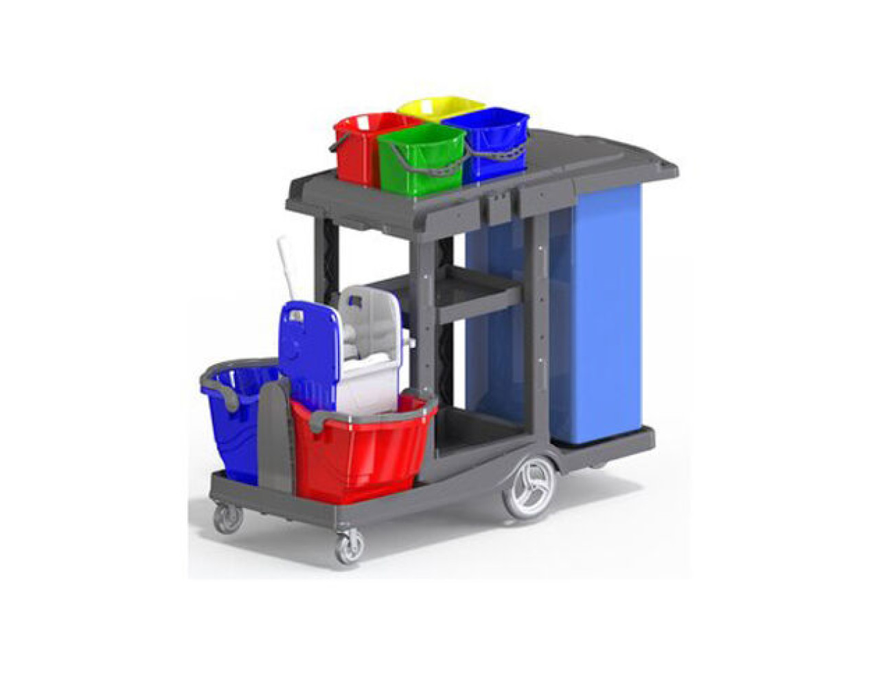 RMV Reinigungswagen PE Safety Sehr stabiler Reinigungswagen mit paralleler Zwei-Eimer-Wischeinheit und einer 1 x 120 Liter oder 2 x 60 Liter Abfalleinheit (Trennvorrichtung ist inbegriffen). Vorteile sehr stabile Mopp-Presse 2 große Kunststoff-Ablagewannen 2 Premium Deluxe Eimer 17 L mit 4 farbigen Eimern für die Trennung der verschiedenen Einsatzbereiche Halterung für Wischsysteme, Mopp oder Besen auf beiden Seiten ideal für große Flächen mit Anfahrschutz inkl. Textil-Entsorgungssack / Wäschesack schnelle und einfach Montage Produkteigenschaften Größe: 133 x 52 x 102 cm Gewicht: 25 kg VE: 1
